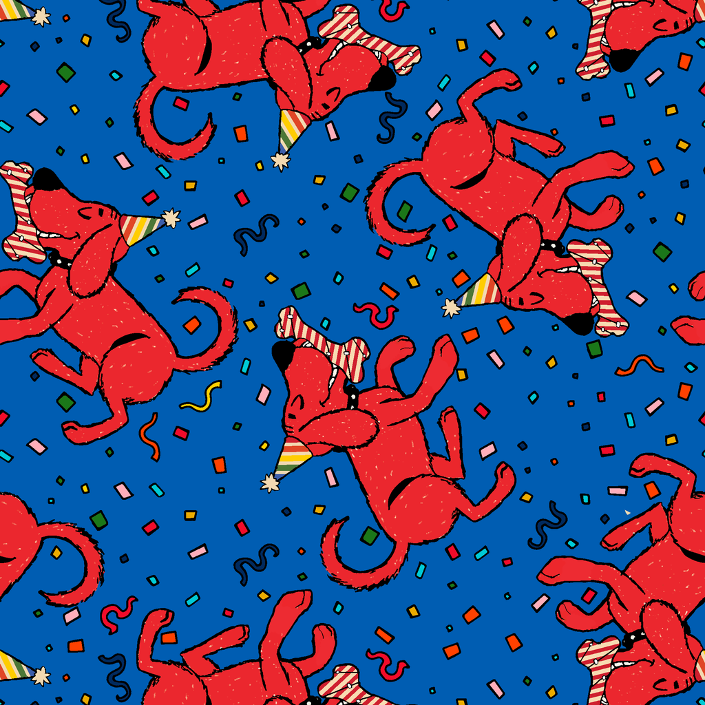 Let's Pawty- playful Clifford the Big Red Dog on a blue background surrounded by confetti, party hats and more. Perfect for children's party themes.