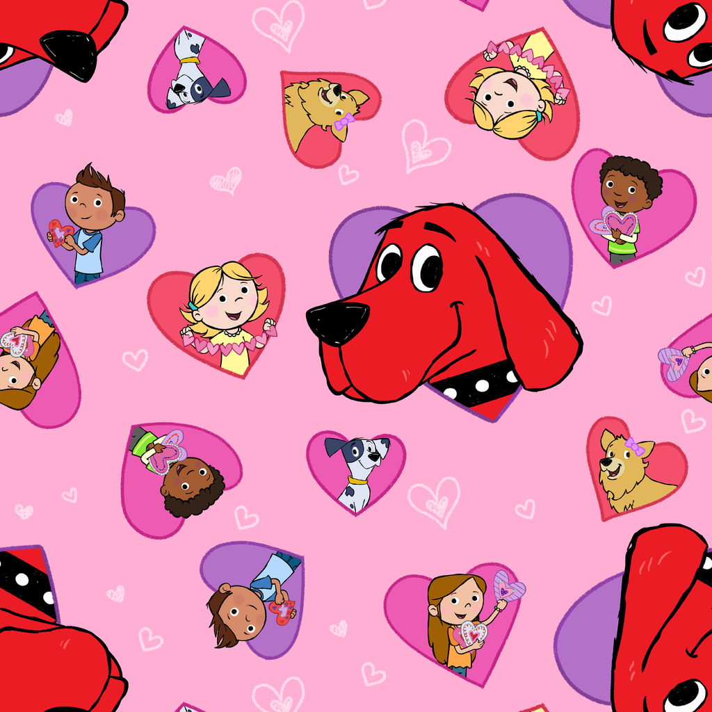 Adorable Clifford the Big Red Dog featuring the beloved character, Clifford and his friends in colorful heart shapes on a pink background. Perfect for Clifford fans of all ages!