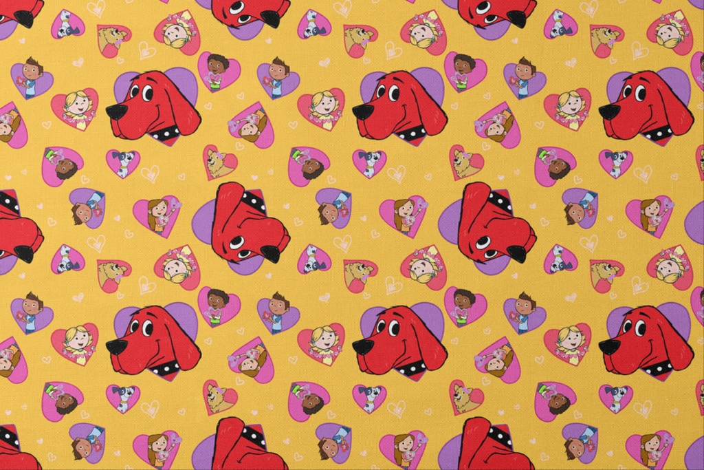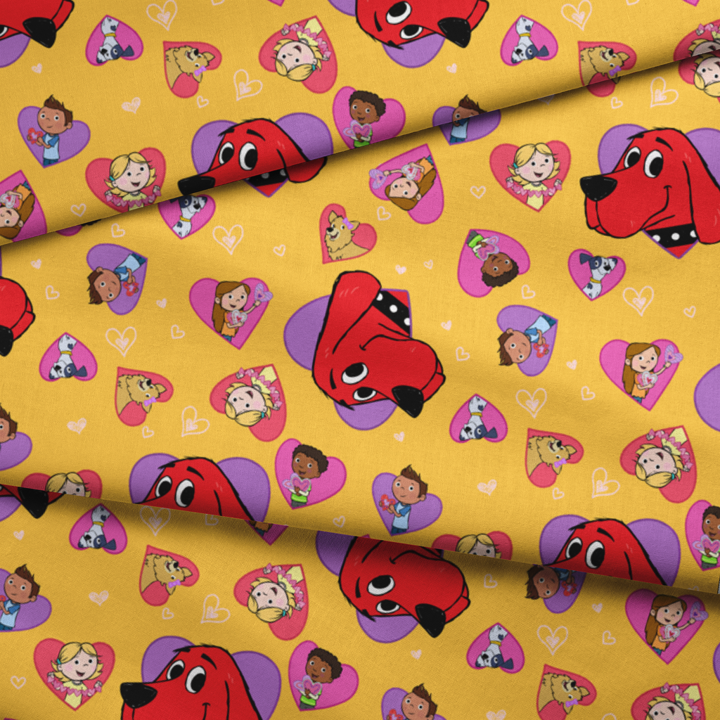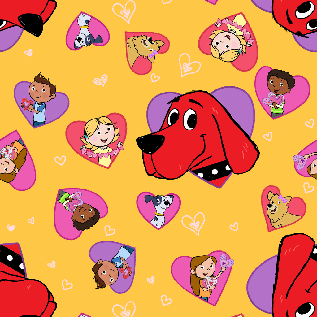 Adorable Clifford the Big Red Dog featuring the beloved character, Clifford and his friends in colorful heart shapes on a yellow background. Perfect for Clifford fans of all ages!