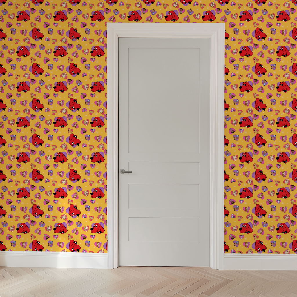 Adorable Clifford the Big Red Dog featuring the beloved character, Clifford and his friends in colorful heart shapes on a yellow background. Perfect for Clifford fans of all ages!