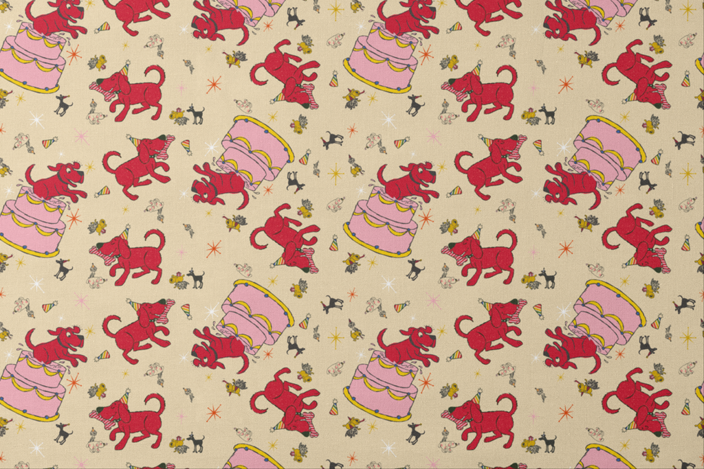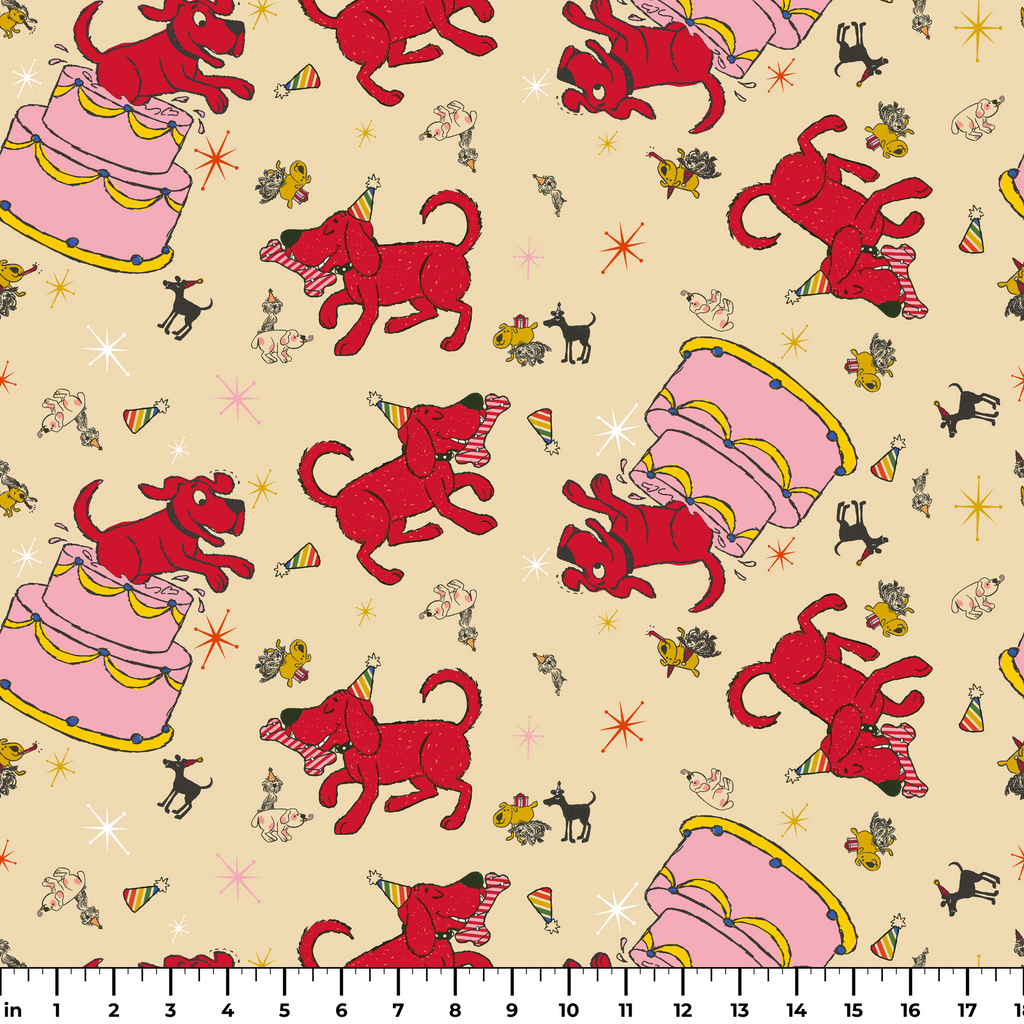 This whimsical Clifford the Big Red Dog features playful Clifford & friends, pink birthday cakes, and small decorative stars, hats and confetti on a beige background. Perfect for celebrations and party themes.