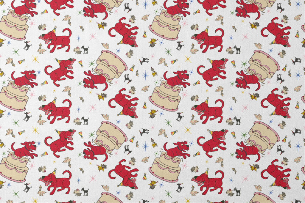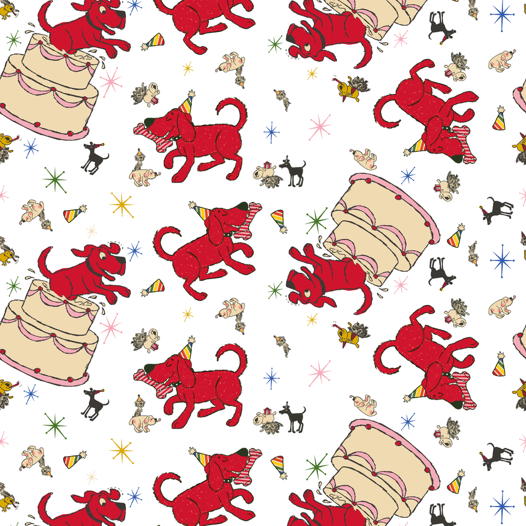 This whimsical Clifford the Big Red Dog features playful Clifford & friends, birthday cakes, and small decorative stars, hats and confetti on a white background. Perfect for celebrations and party themes.
