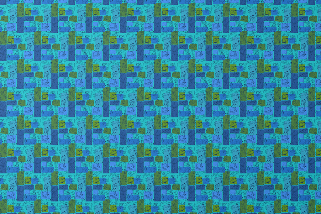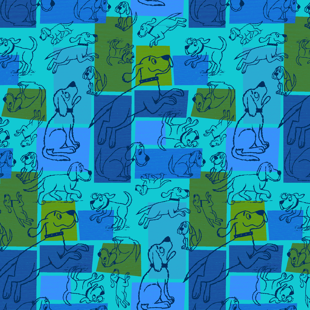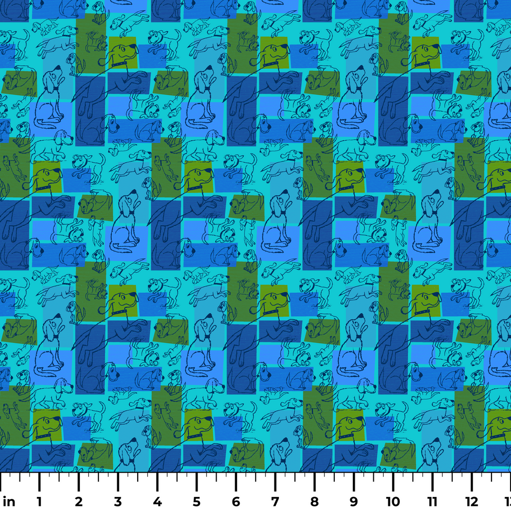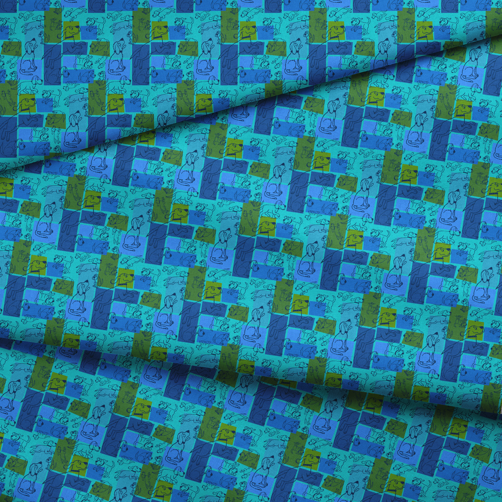 This playful retro pattern features Clifford the Big Red Dog stylized illustrations in varying poses across a vibrant blue and green color block & patchwork background. Perfect for all pet lovers!