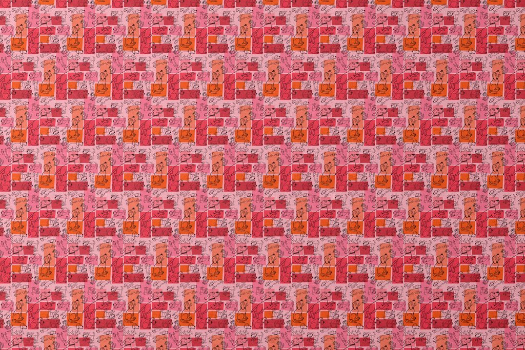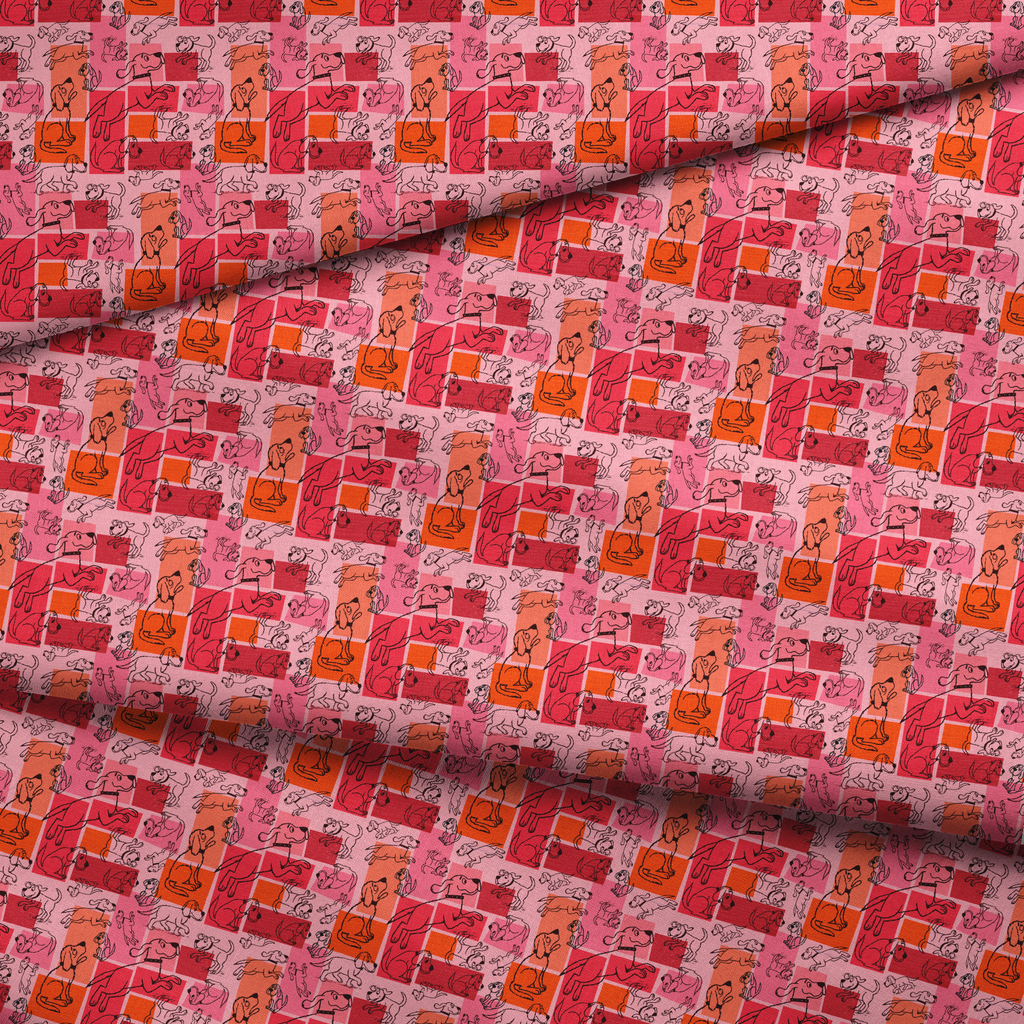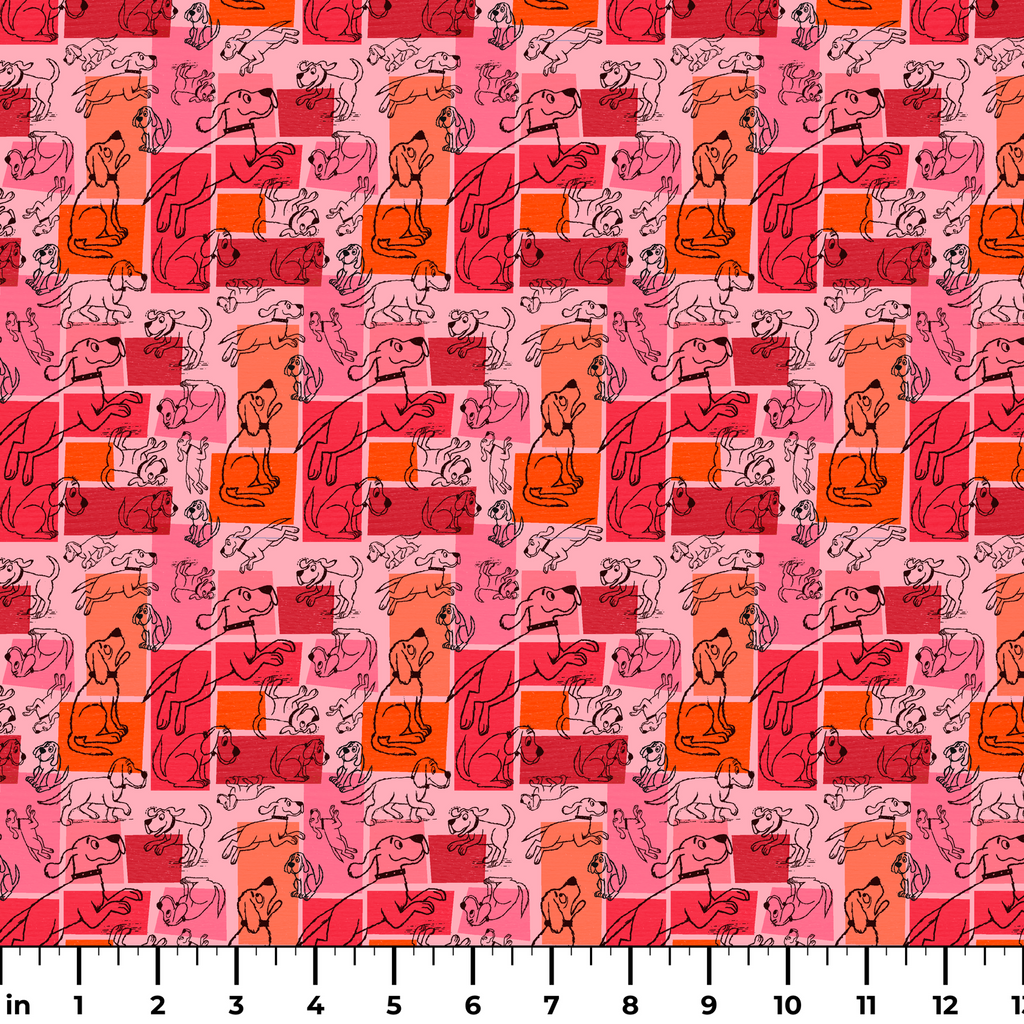 This playful retro pattern features Clifford the Big Red Dog stylized illustrations in varying poses across a vibrant pink and orange color block & patchwork background. Perfect for all pet lovers!