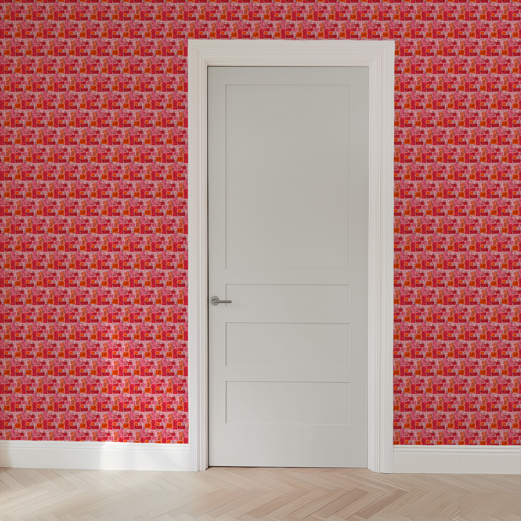 This playful retro pattern features Clifford the Big Red Dog stylized illustrations in varying poses across a vibrant pink and orange color block & patchwork background. Perfect for all pet lovers!