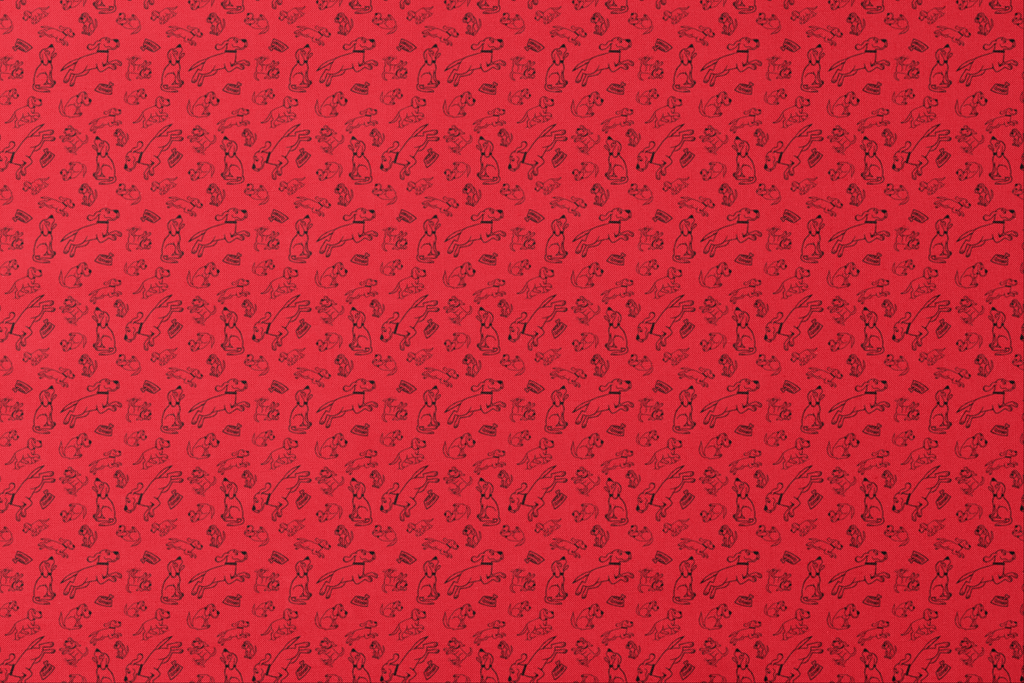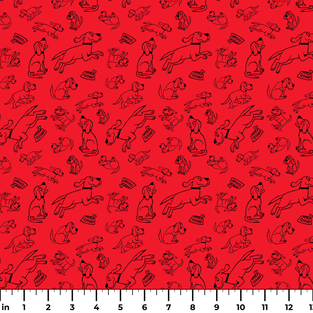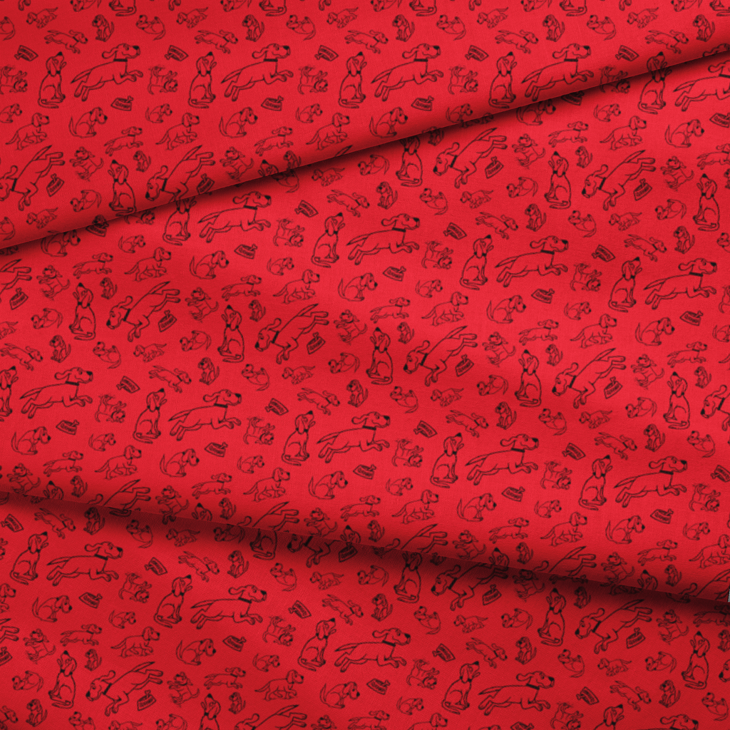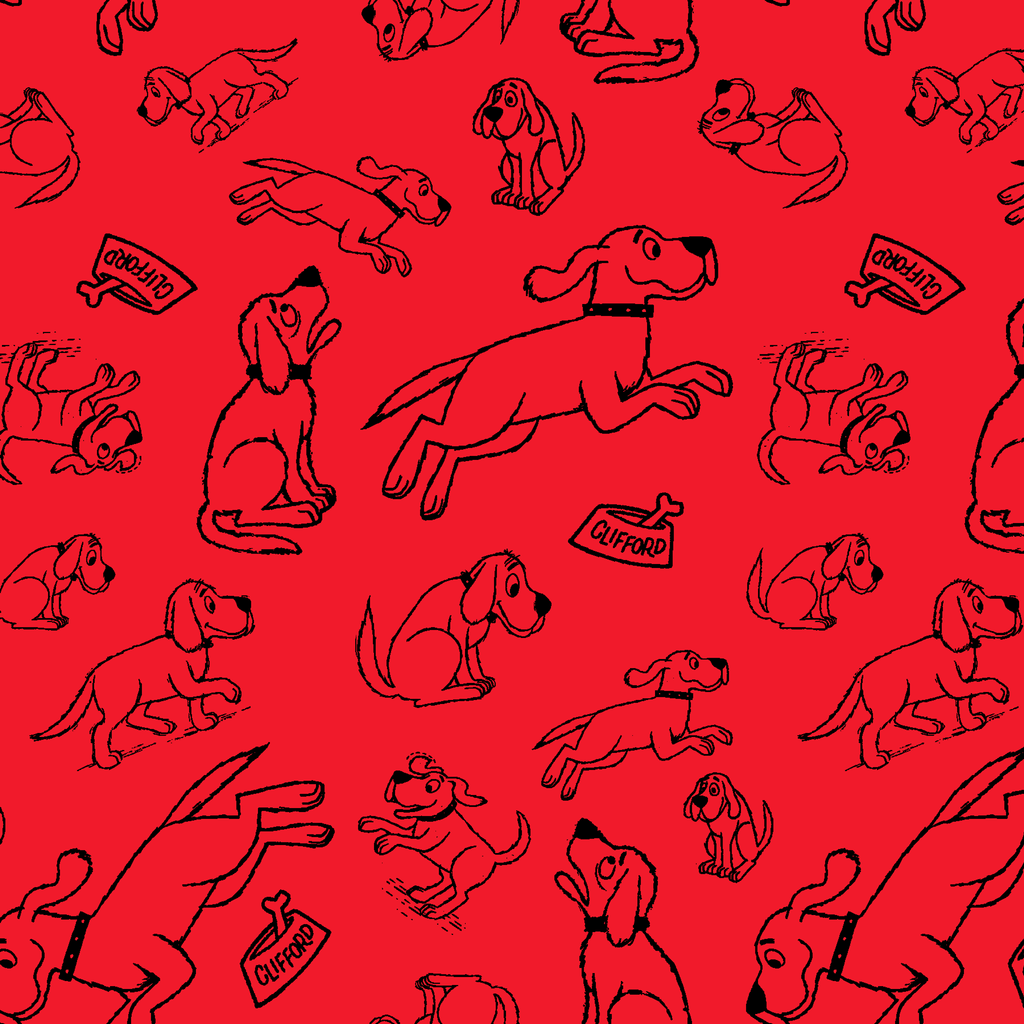 Clifford the Big Red dog zooms around in playful poses - running, sitting, and jumping on a red background creating a charming and energetic pattern that Clifford fans of all ages will adore.