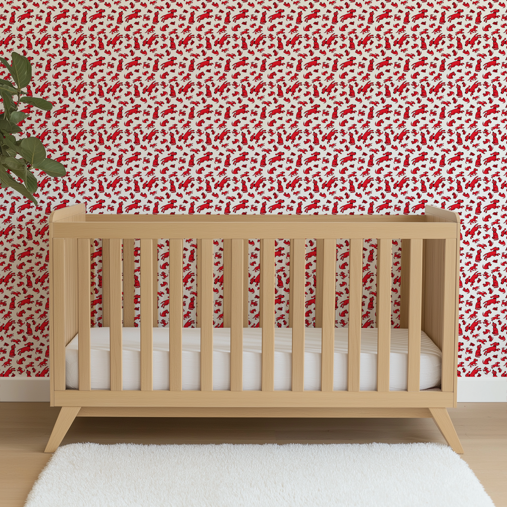 Clifford the Big Red dog zooms around in playful poses - running, sitting, and jumping on a white background creating a charming and energetic pattern that Clifford fans of all ages will adore.