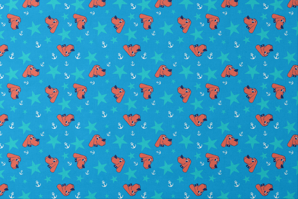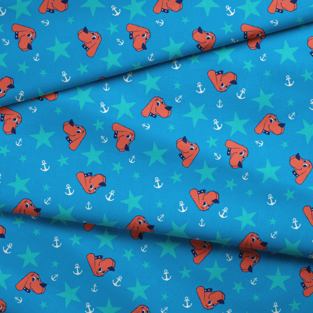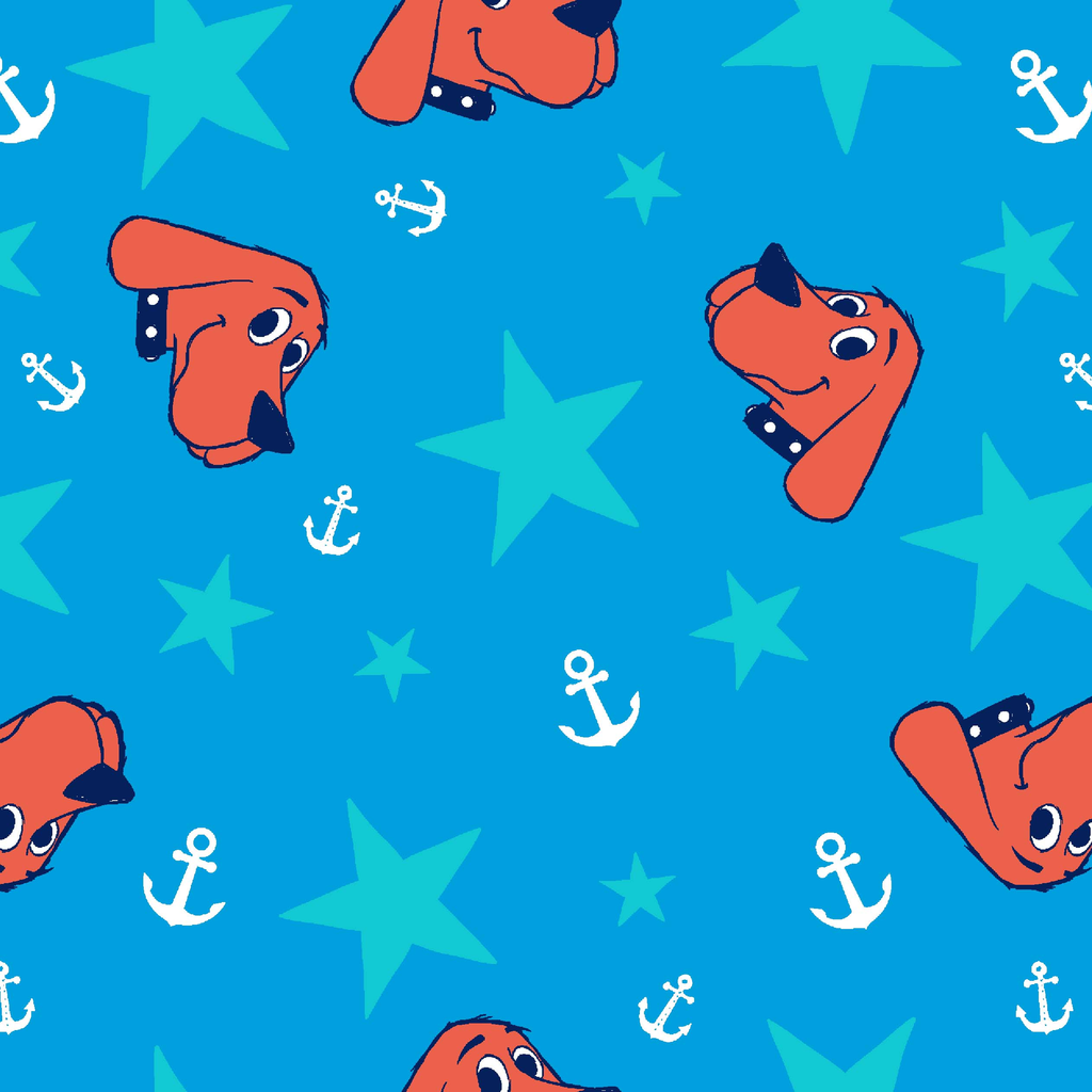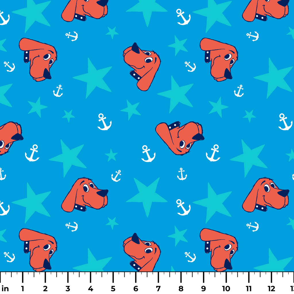 Playful Clifford head toss pattern featuring aqua stars and white anchors on a blue background. Perfect for coastal decor or children's rooms.