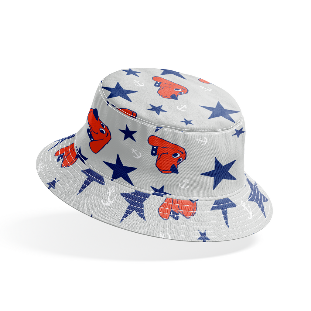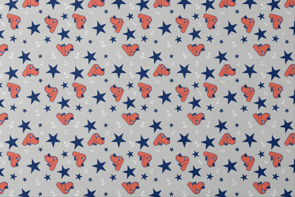 Playful Clifford head toss pattern featuring stars and anchors on a light gray background. Perfect for coastal decor or children's rooms.