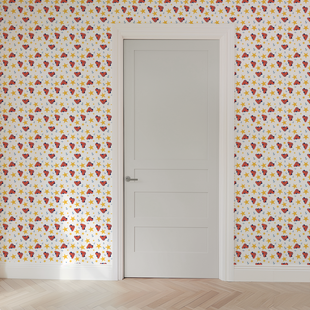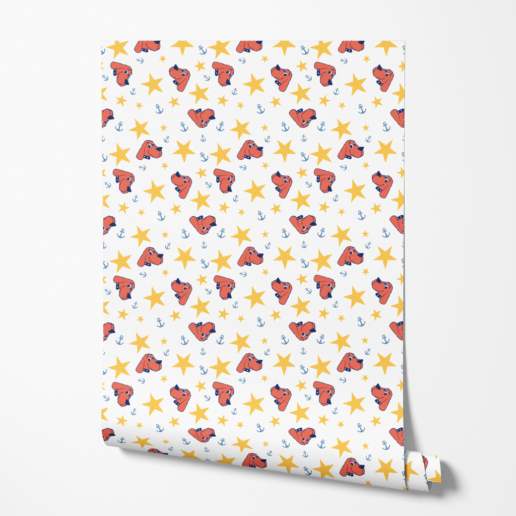 Playful Clifford head toss pattern featuring yellow stars and blue anchors on a white background. Perfect for children's rooms.