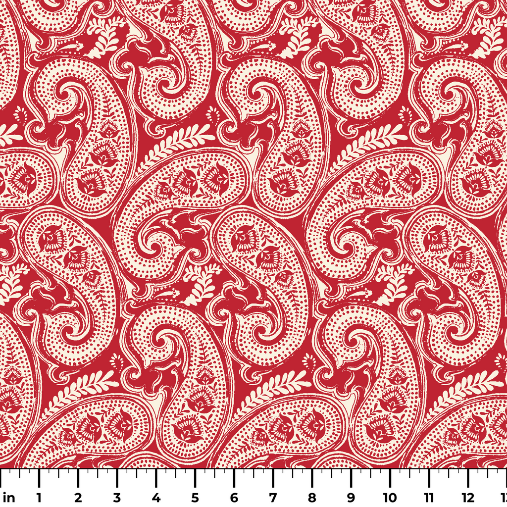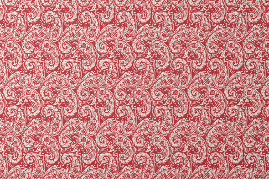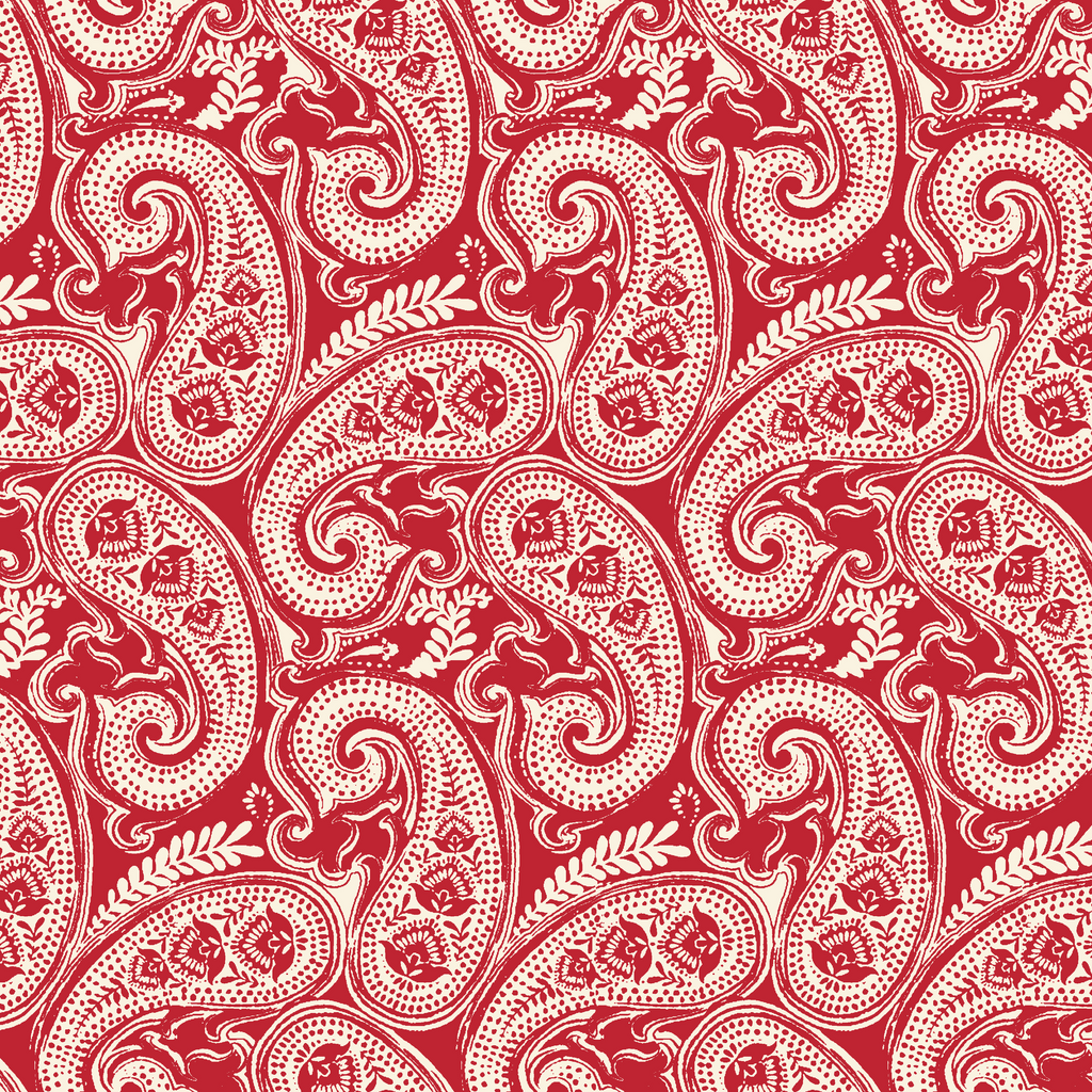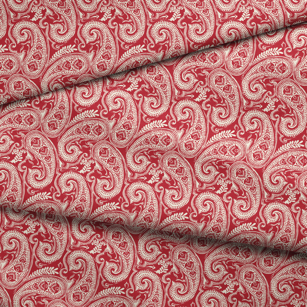 Bold cream paisley swirls against a red backdrop create a stunning traditional design with modern flair. Intricate dotted details and delicate floral elements nestle within each curved paisley, adding texture and depth to this eye-catching pattern. This fabric would make a showstopping accent pillow or a beautiful table runner for holiday gatherings.