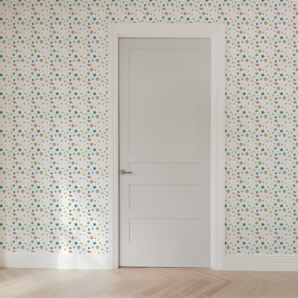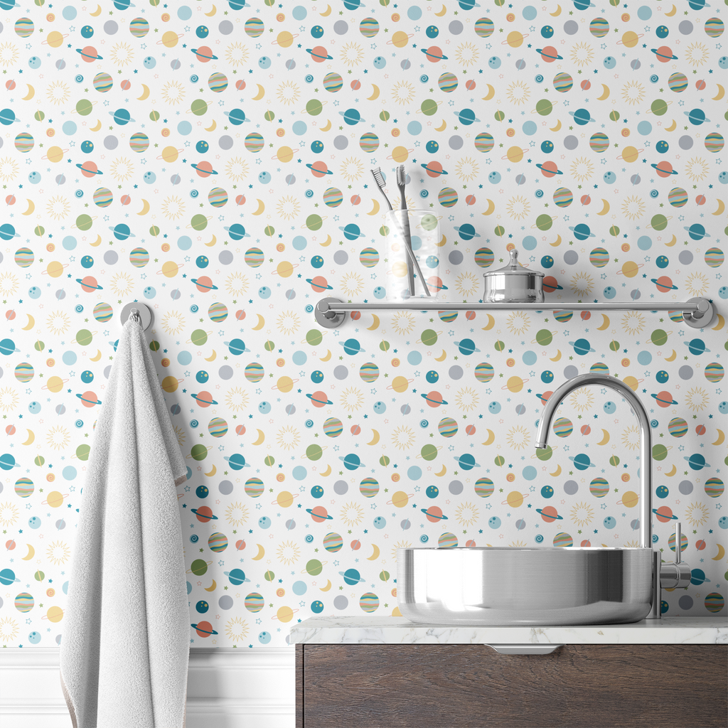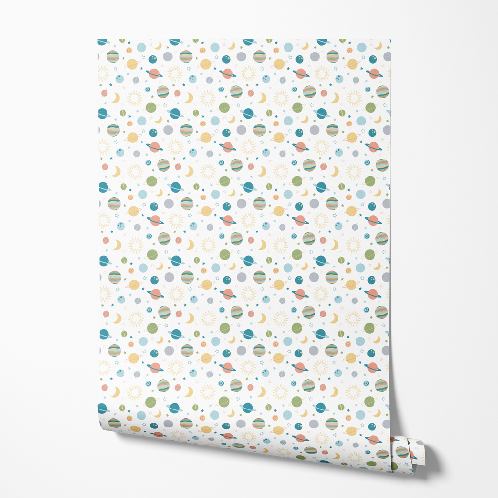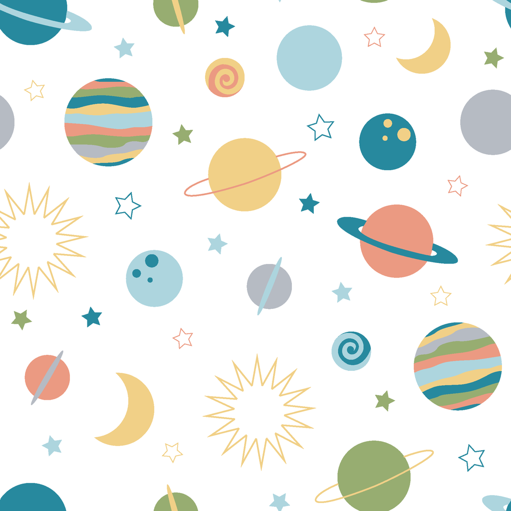 Whimsical space pattern featuring bold colorful planets, stars, moons, and suns on a white background - perfect for nurseries or children's rooms.