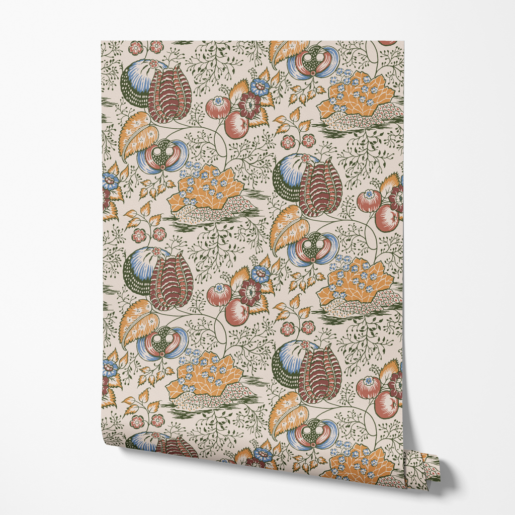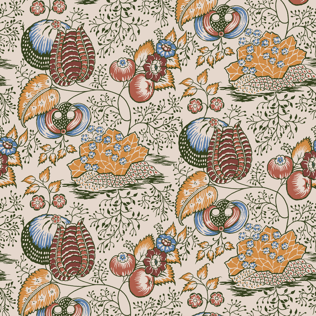 Vintage botanical pattern featuring traditional folk art motifs with autumn fruits, leaves, and organic shapes in warm earth tones and muted colors.