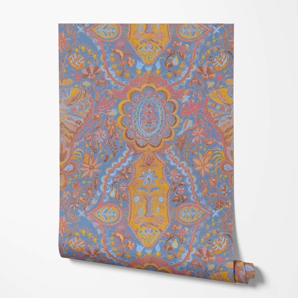 Vintage paisley mandala pattern in vibrant orange, blue and red hues with intricate bohemian damask motifs and traditional ornate decorative elements.
