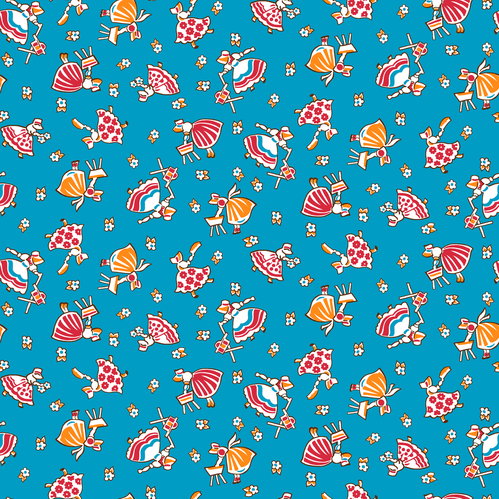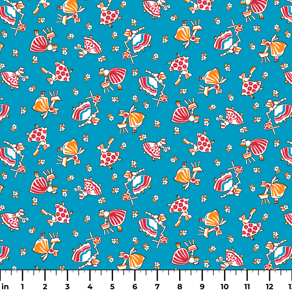 Delightful folk art figurines scatter across a tranquil blue background in this charming retro-inspired print. Playful Sunbonnet Sue characters in various poses wear vibrant dresses in cranberry red, marigold orange, and crisp white, surrounded by dainty white flowers. The whimsical, nostalgic design has a handcrafted quality that brings warmth to any sewing project. Perfect for quilting, children's clothing, or crafting sweet nursery accessories with a touch of timeless Americana.