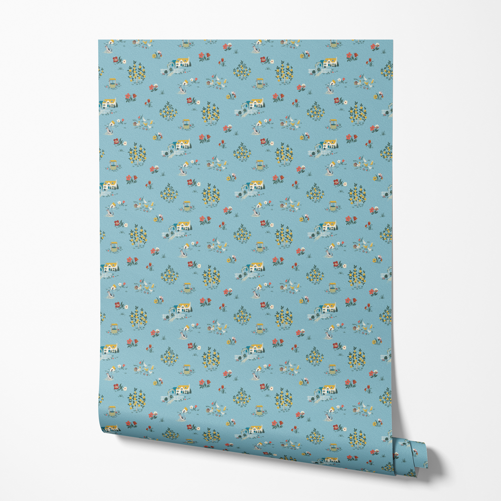 Charming cottage design with whimsical houses, tulip flowers, and folk art motifs on a soft blue background. Perfect for charming nurseries and playrooms.