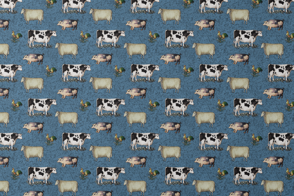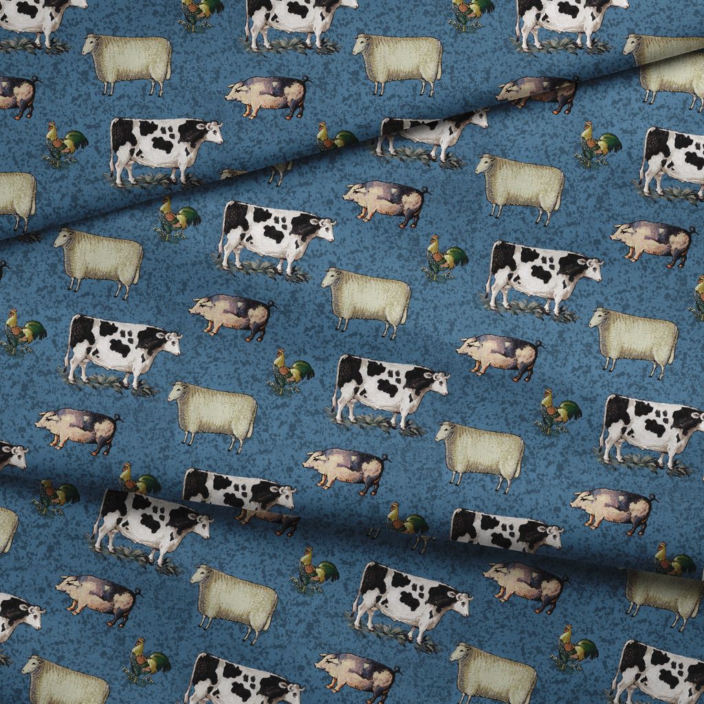 Charming farm animals including Holstein cows, sheep, pigs and chickens scattered across a rich blue background in a whimsical country pattern perfect for rustic farmhouse decor.