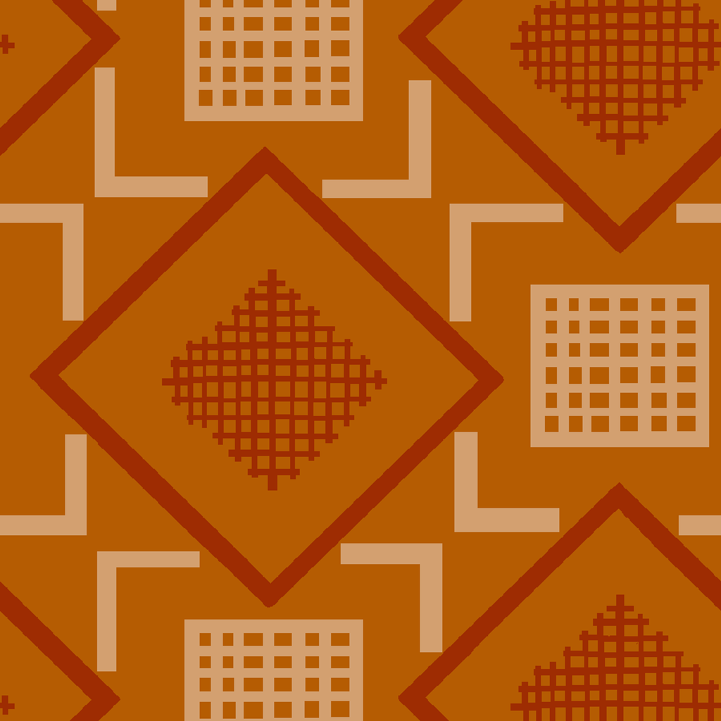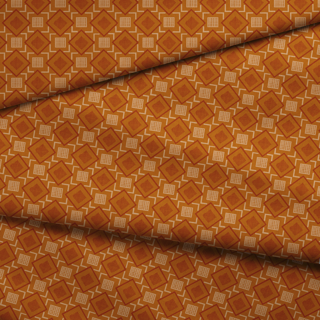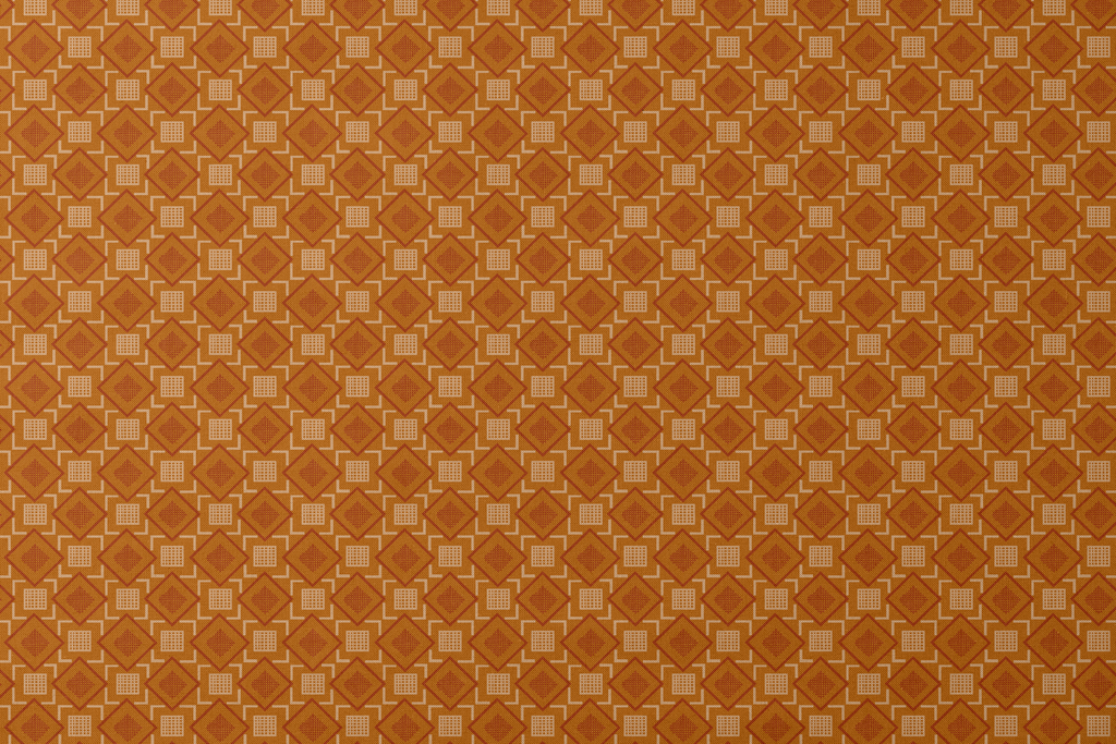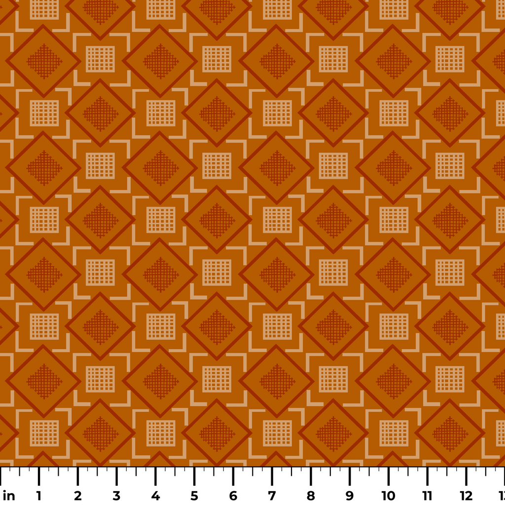 Retro geometric pattern with tan and burgundy diamonds featuring grid motifs on a brunt orange background, perfect for vintage home decor and quilting projects.