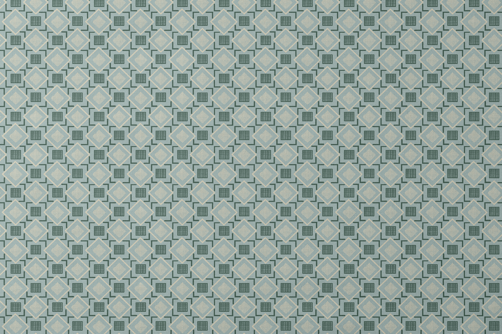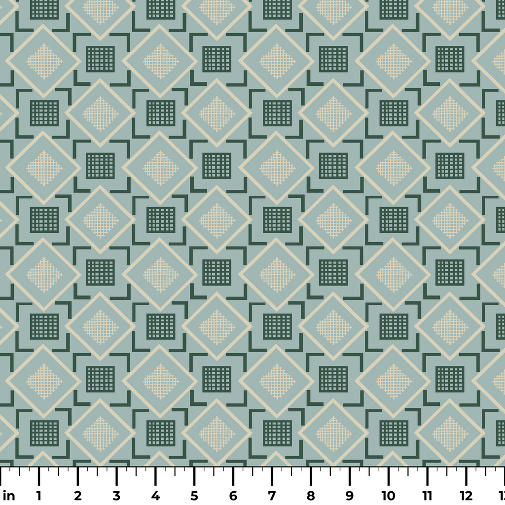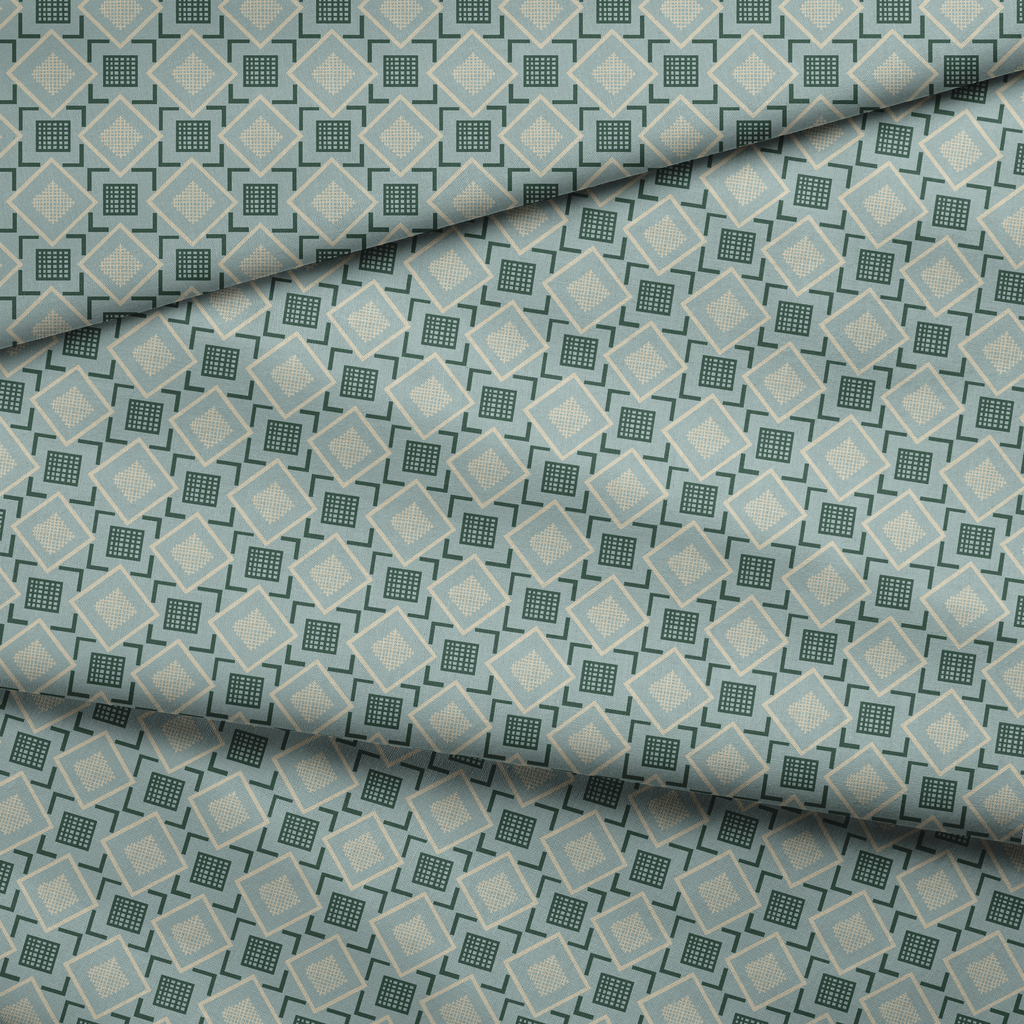 Geometric pattern features forest green green squares and cream diamond shapes in a contemporary grid design with structured lines on a mint green background.