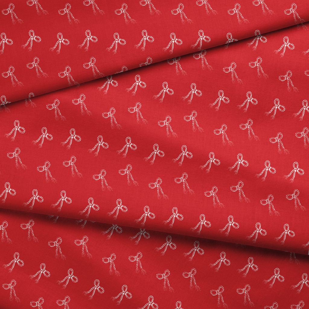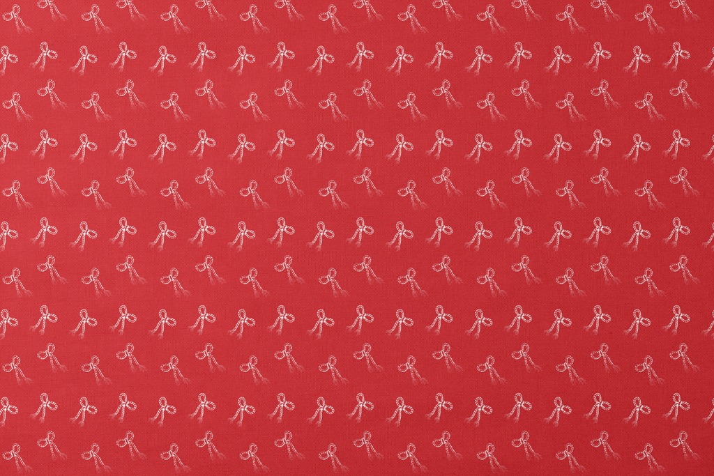 Festive white ribbon bows on a vibrant red background create a traditional holiday pattern perfect for Christmas decor or winter celebrations.
