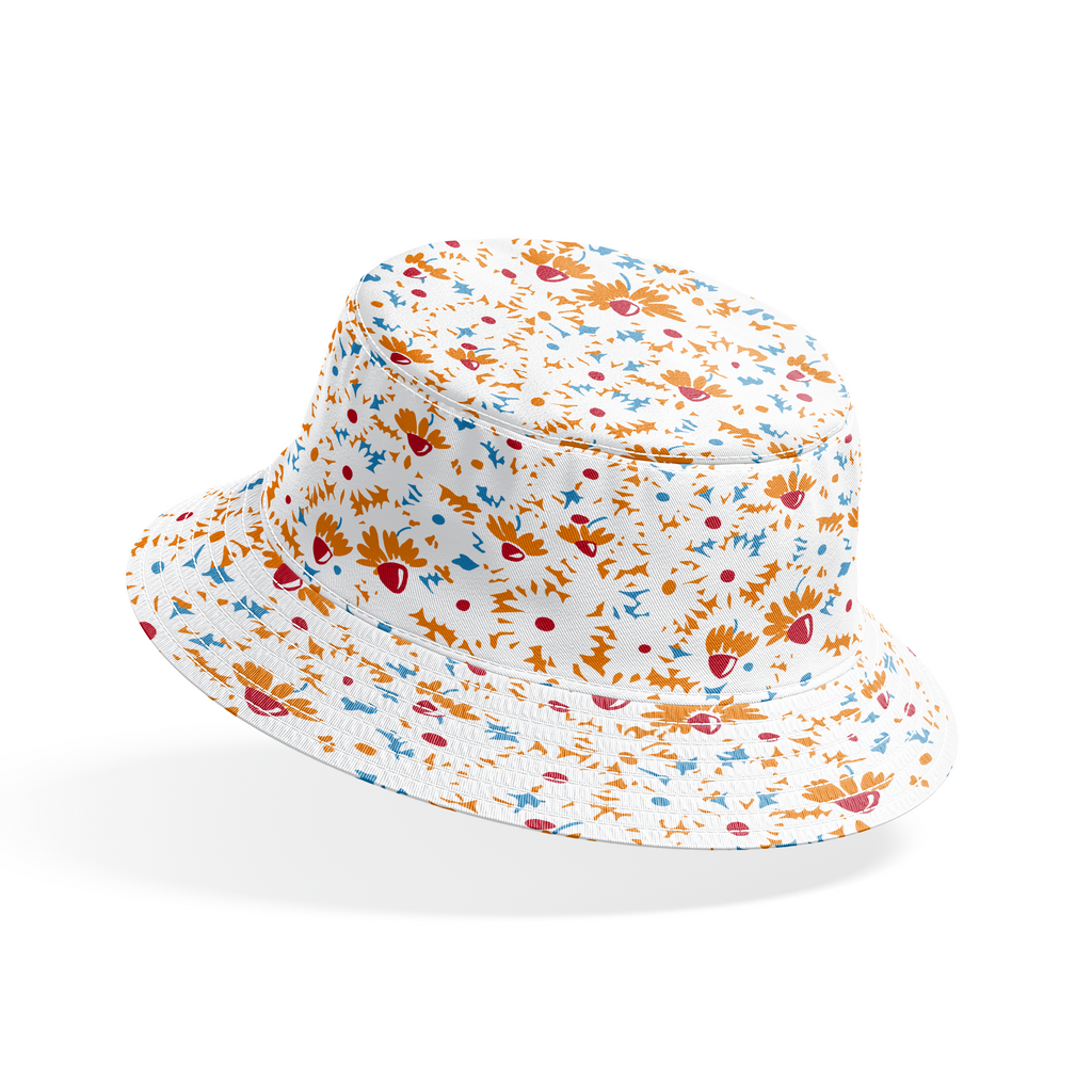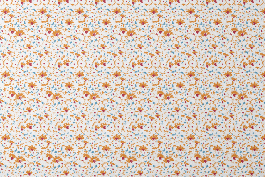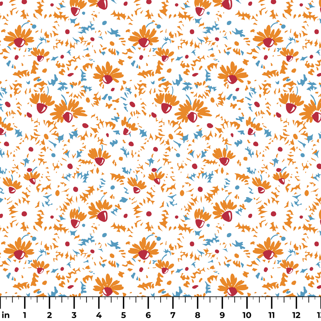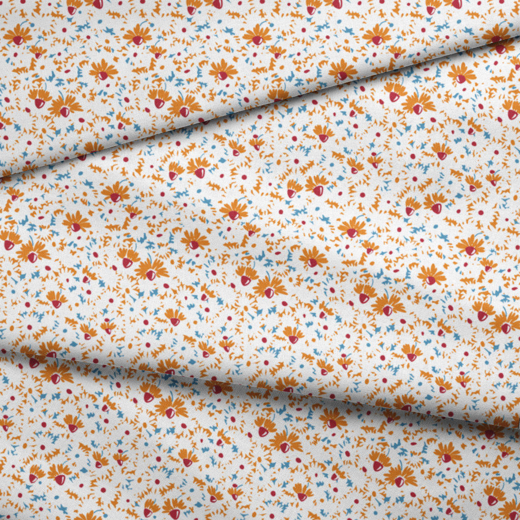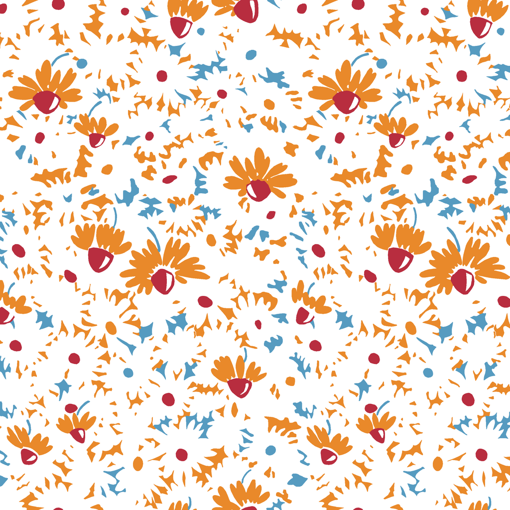 Dancing across a crisp white background, this lively floral pattern features abstract orange daisies with bold crimson centers, complemented by scattered blue accents and gestural marks. The spontaneous, sketch-like quality gives the fabric a joyful energy that feels both modern and carefree. Perfect for summer tote bags or vibrant kitchen accessories that brighten your space with their cheerful presence.