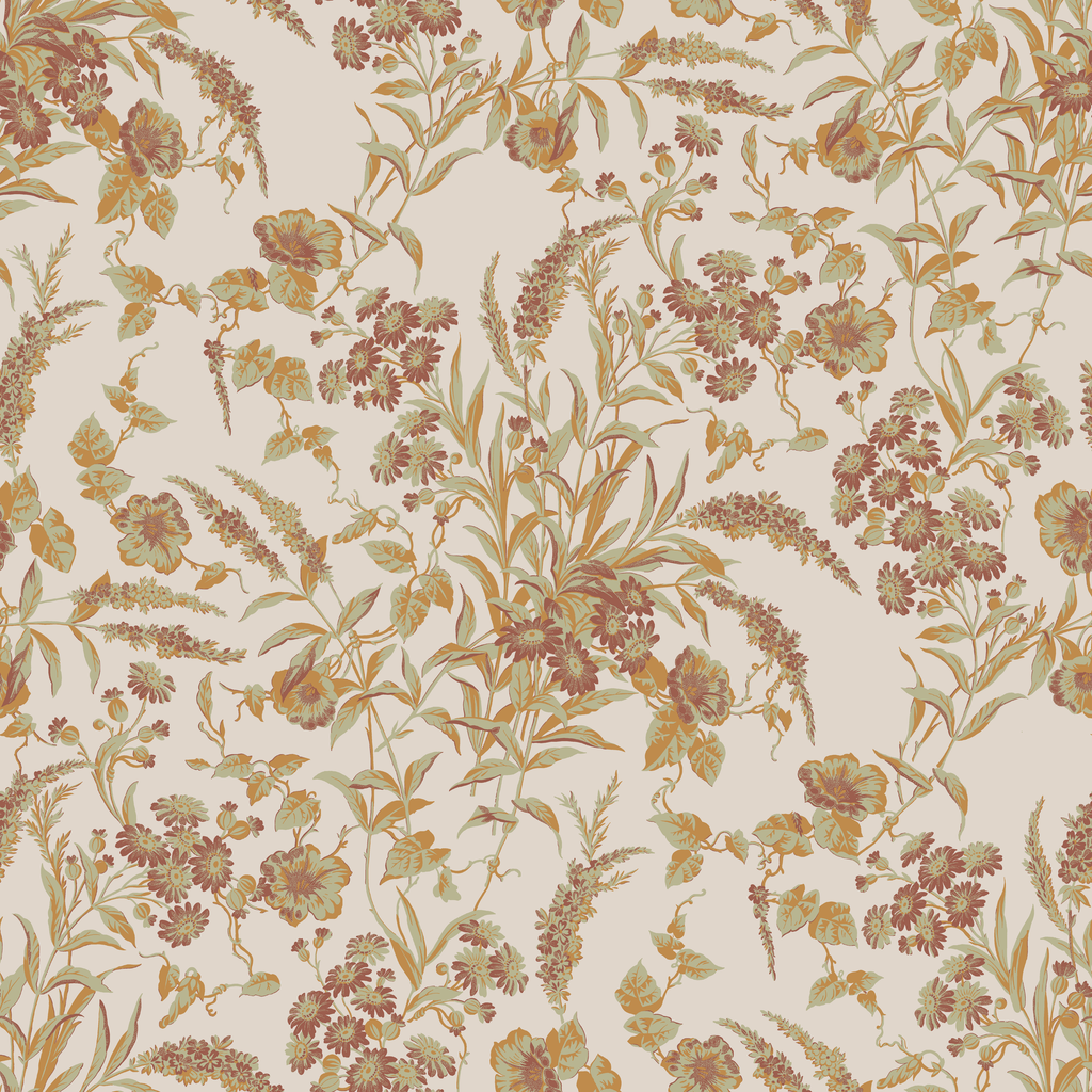 Vintage botanical floral pattern with delicate flowers and foliage in warm earth tones of beige, brown and gold on a neutral background.