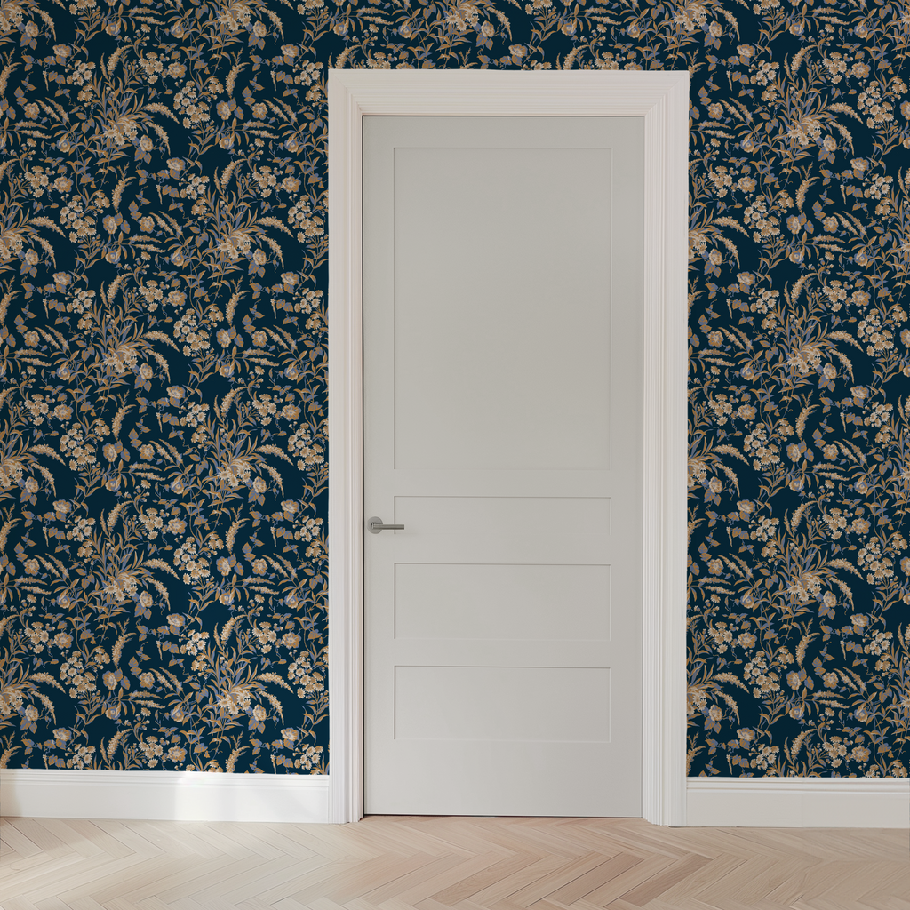 Elegant navy blue floral pattern with vintage botanical blooms and delicate golden leaves in traditional damask style perfect for any space.