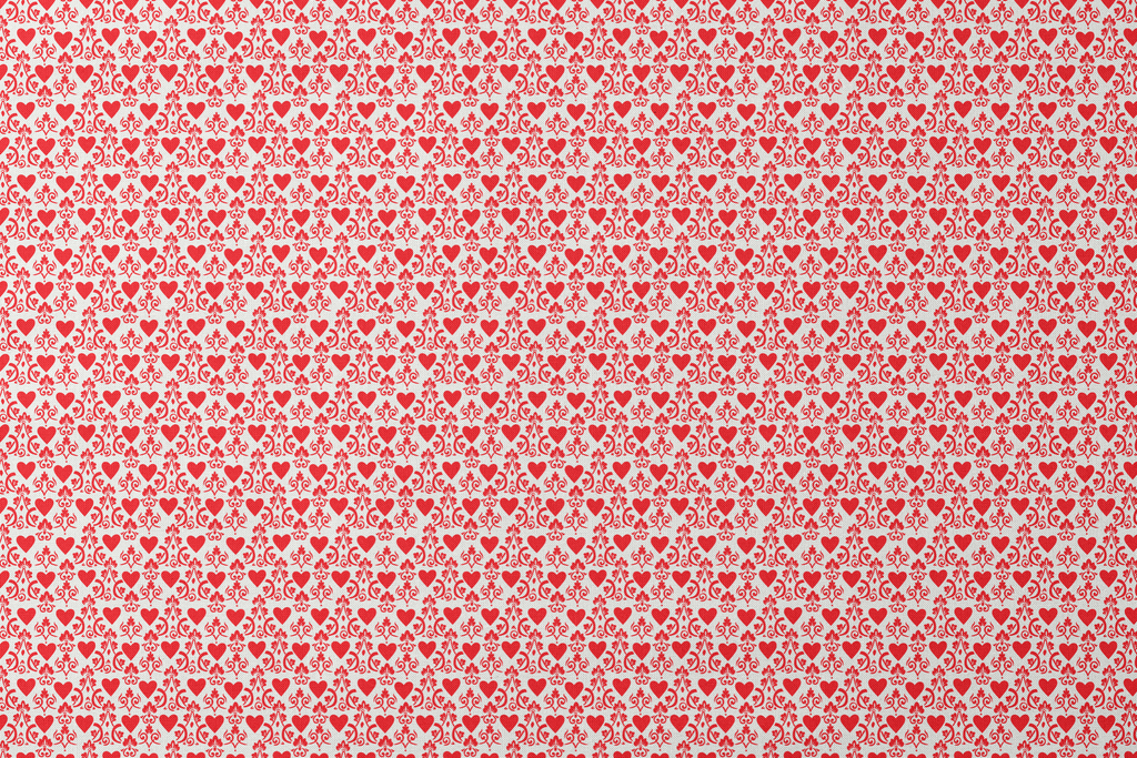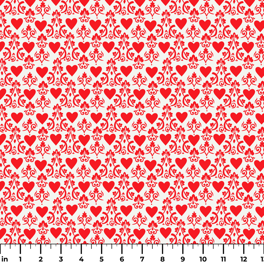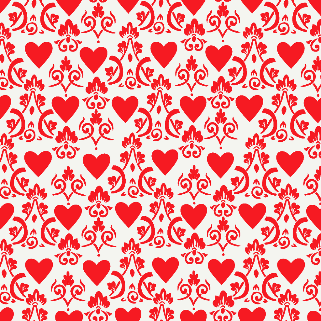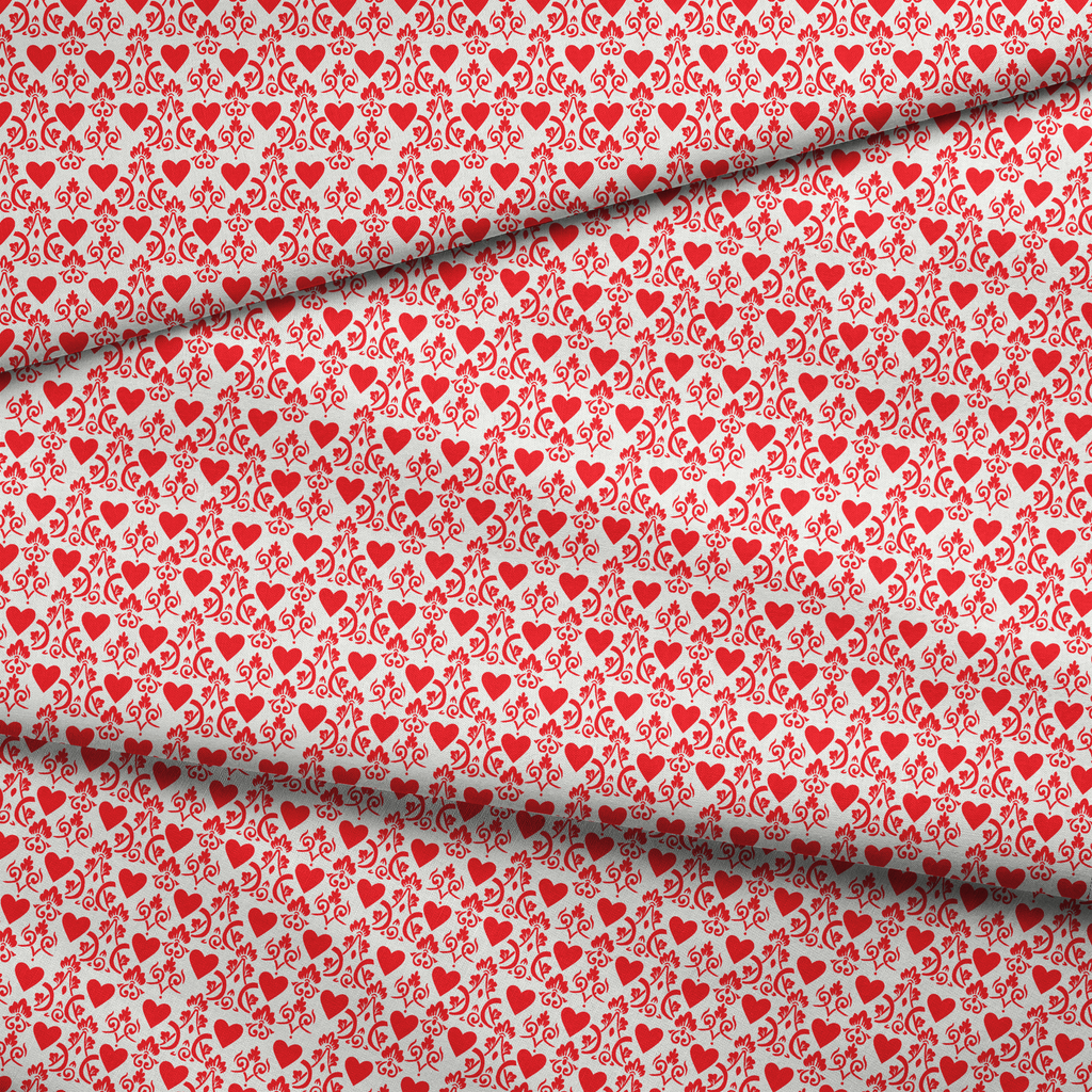 Elegant red damask pattern on a cream background featuring romantic hearts and swirling vines. Perfect for Valentine's Day decor, wedding accents, or feminine apparel with its sweet, whimsical charm.
