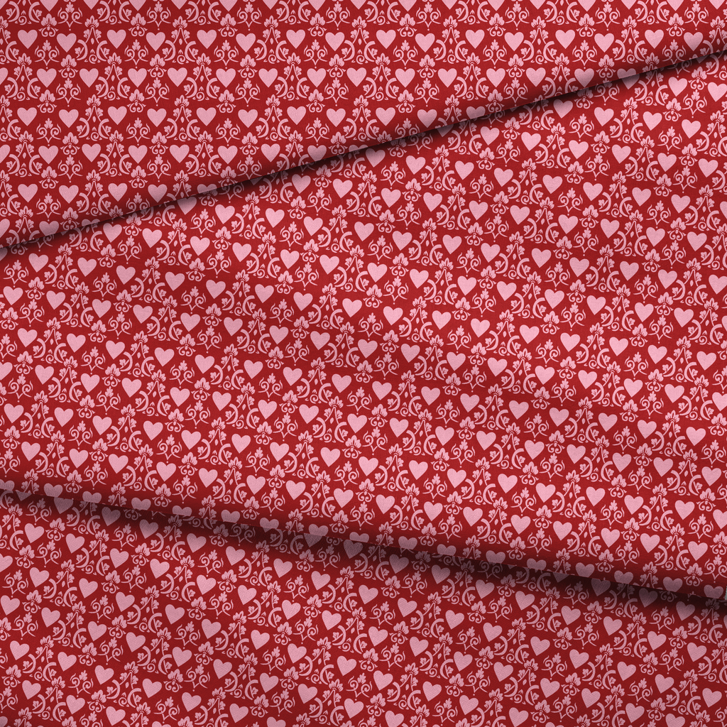 Elegant pink damask pattern on a crimson background featuring romantic hearts and swirling vines. Perfect for Valentine's Day decor, wedding accents, or feminine apparel with its sweet, whimsical charm.