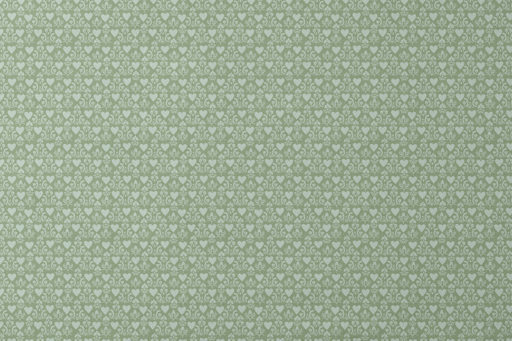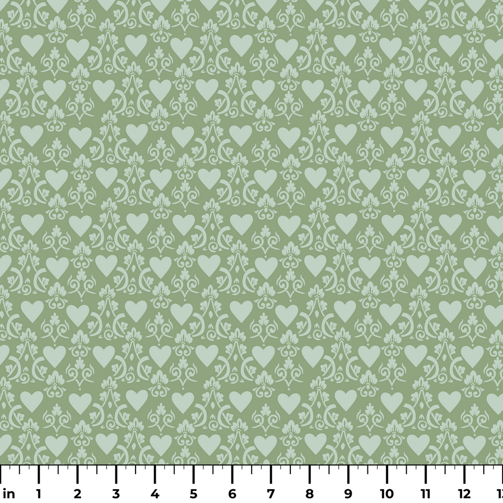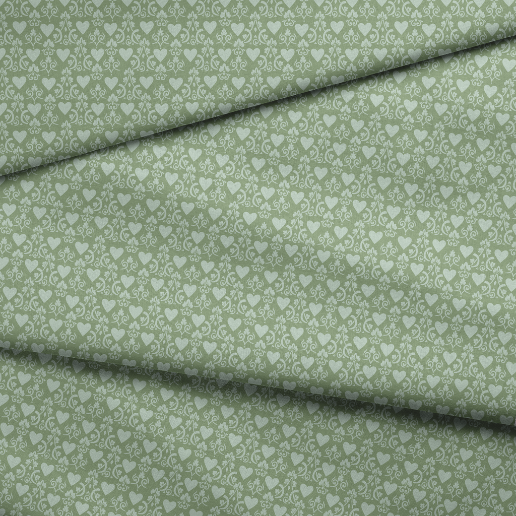 Elegant cream damask pattern on a green background featuring romantic hearts and swirling vines. Perfect for Valentine's Day decor, wedding accents, or feminine apparel with its sweet, whimsical charm.