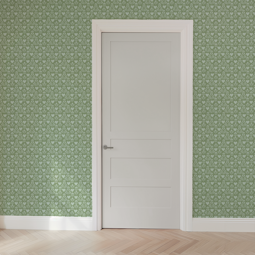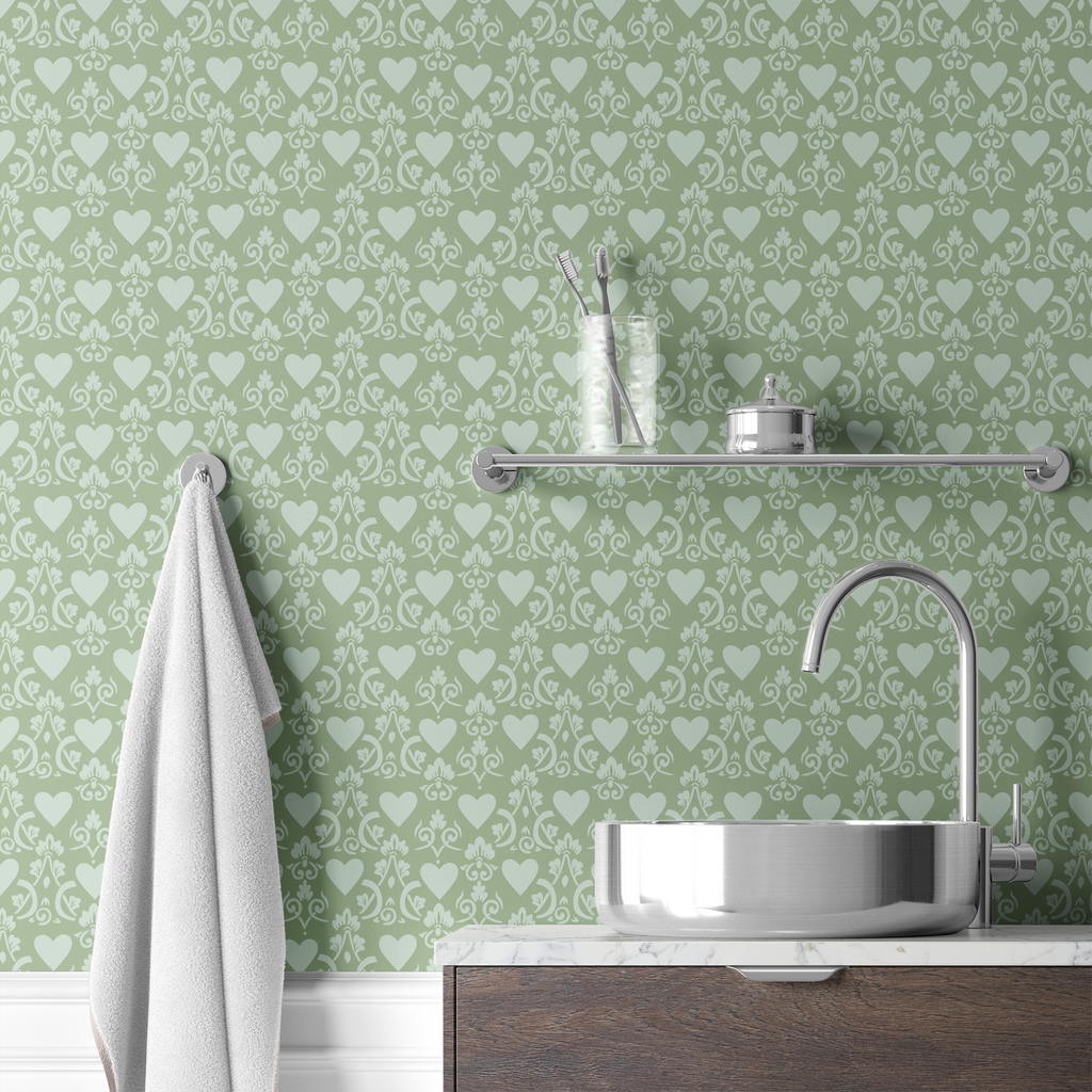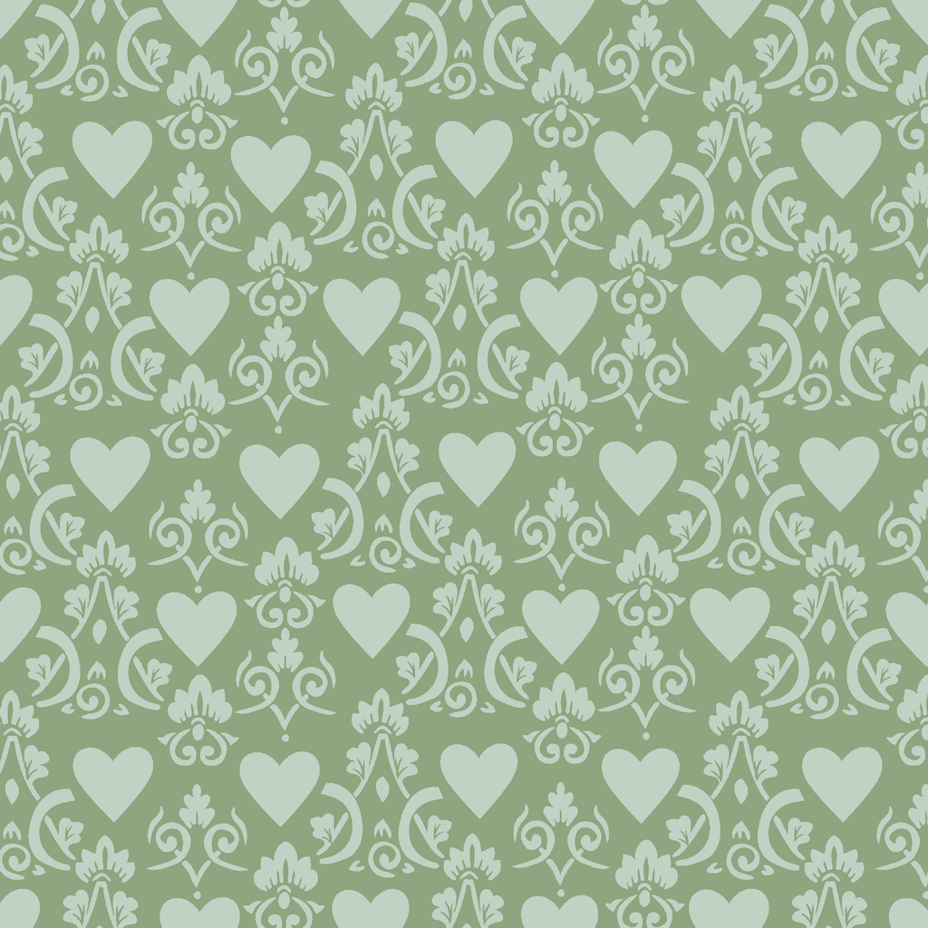 Elegant cream damask pattern on a green background featuring romantic hearts and swirling vines. Perfect for Valentine's Day parties or romantic events in any space.