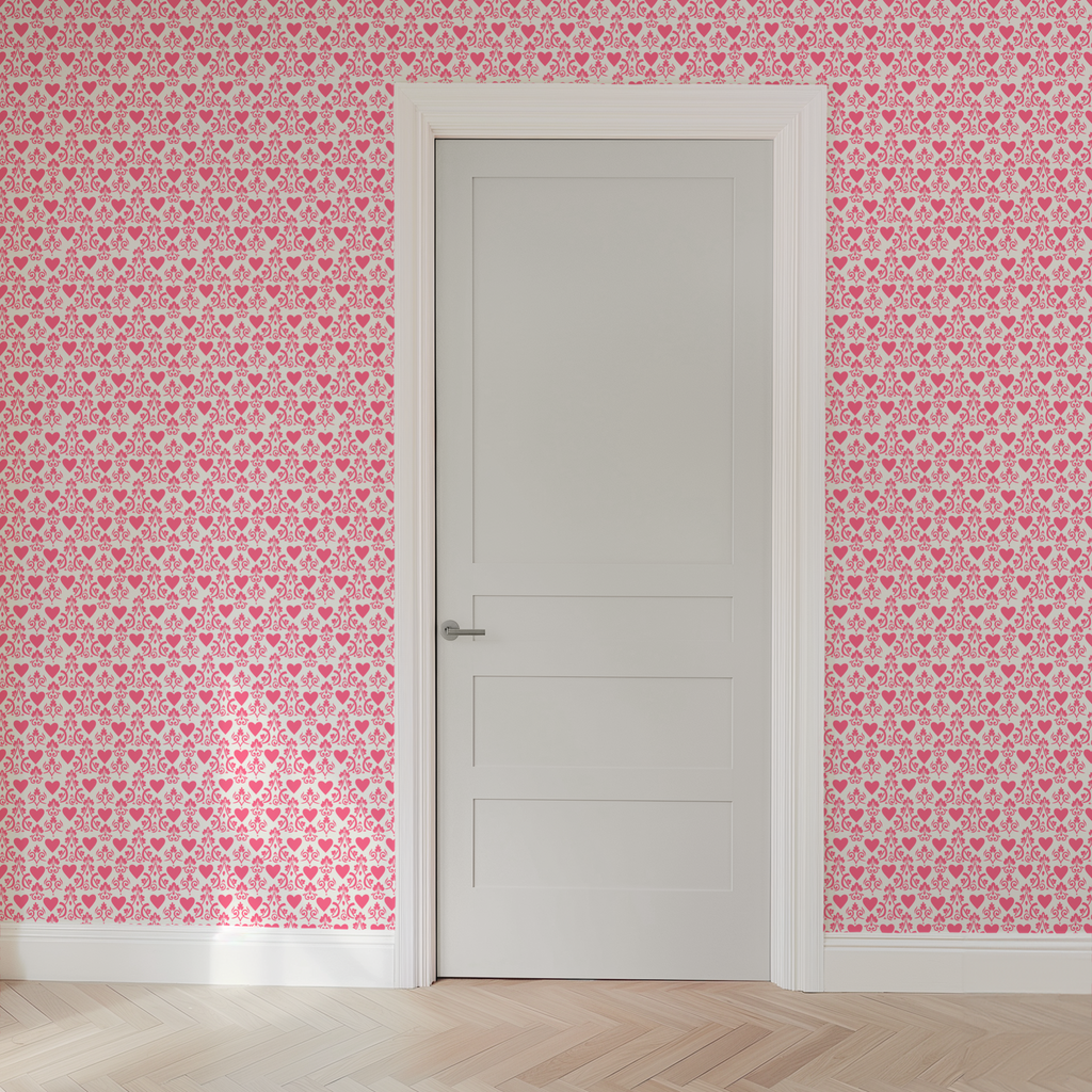 Elegant dark pink damask pattern on a cream background featuring romantic hearts and swirling vines. Perfect for Valentine's Day parties or romantic events in any space.
