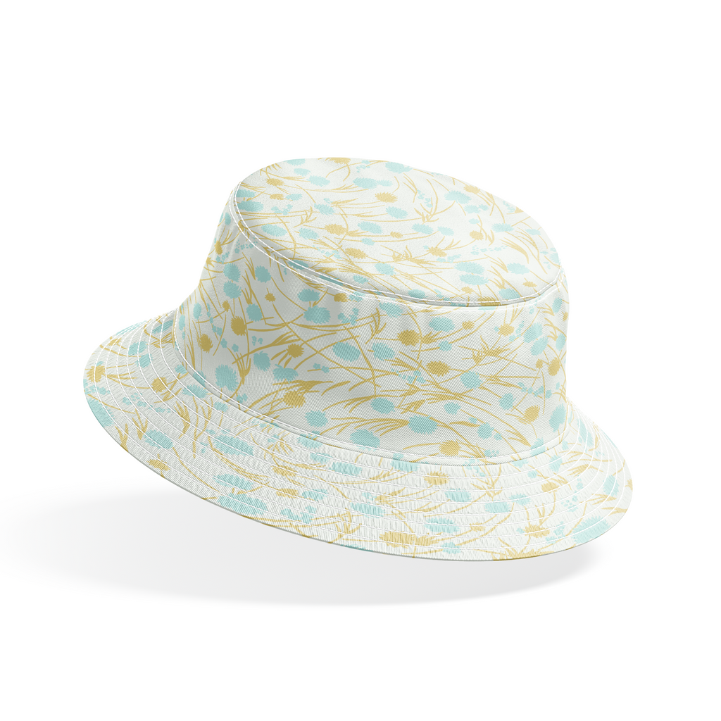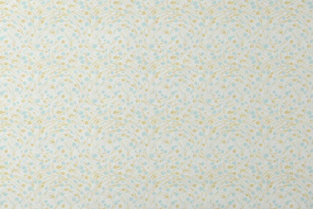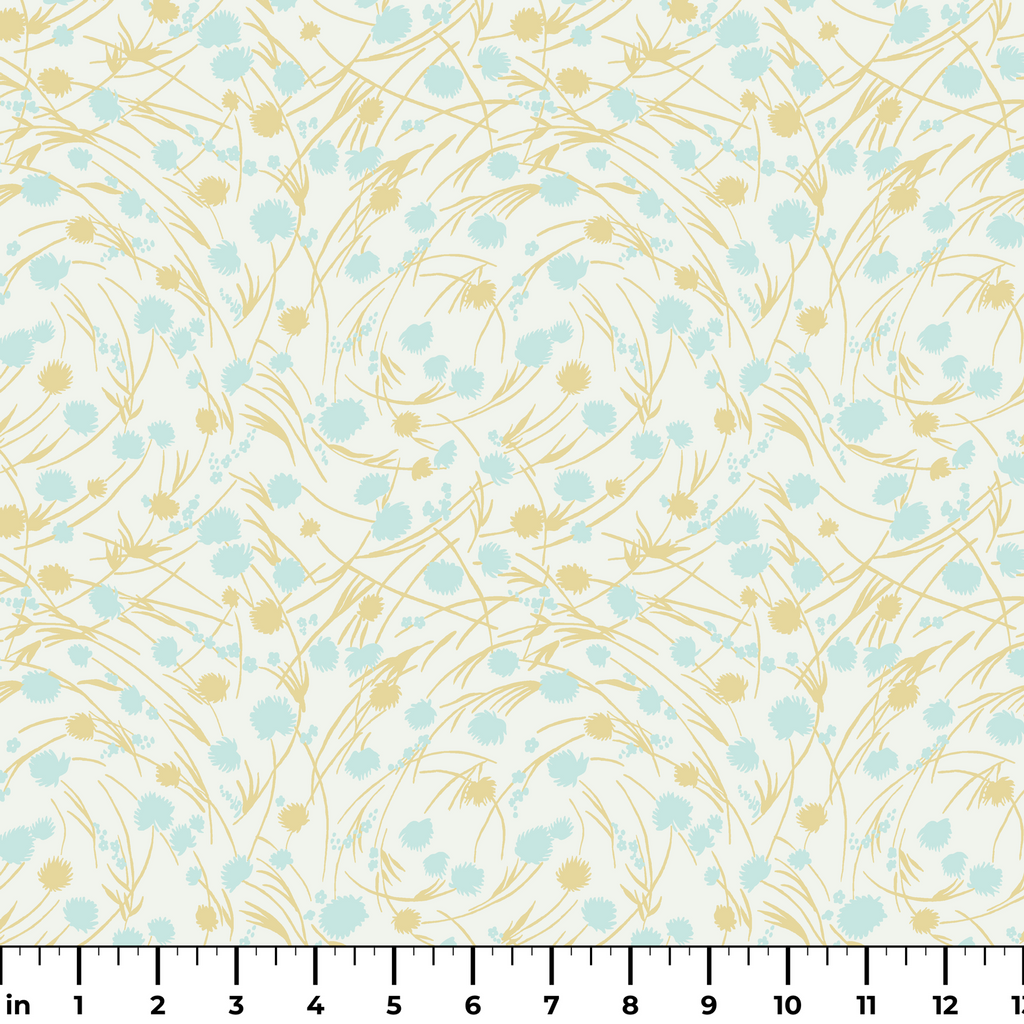 Whimsical botanical pattern featuring delicate flowing grasses and dandelions in soft mint green and golden yellow on a cream background with organic watercolor effects.