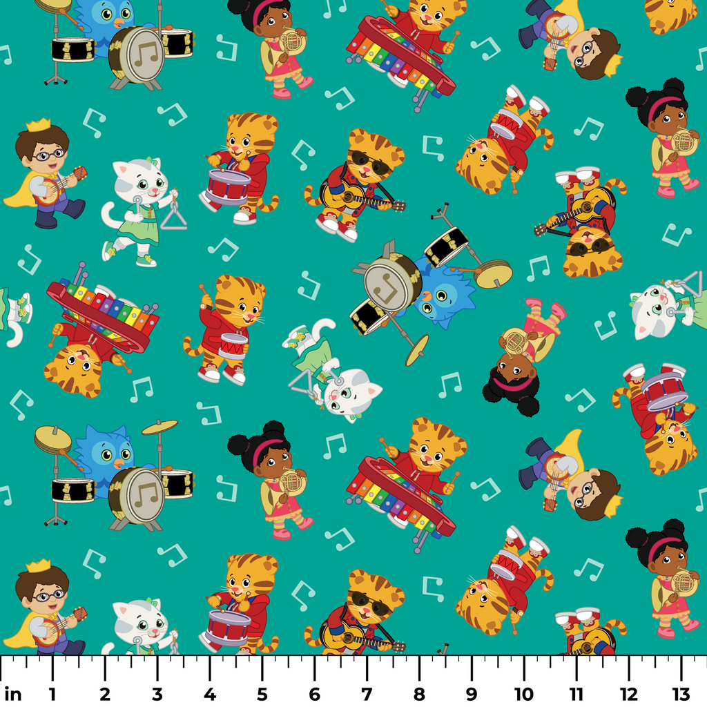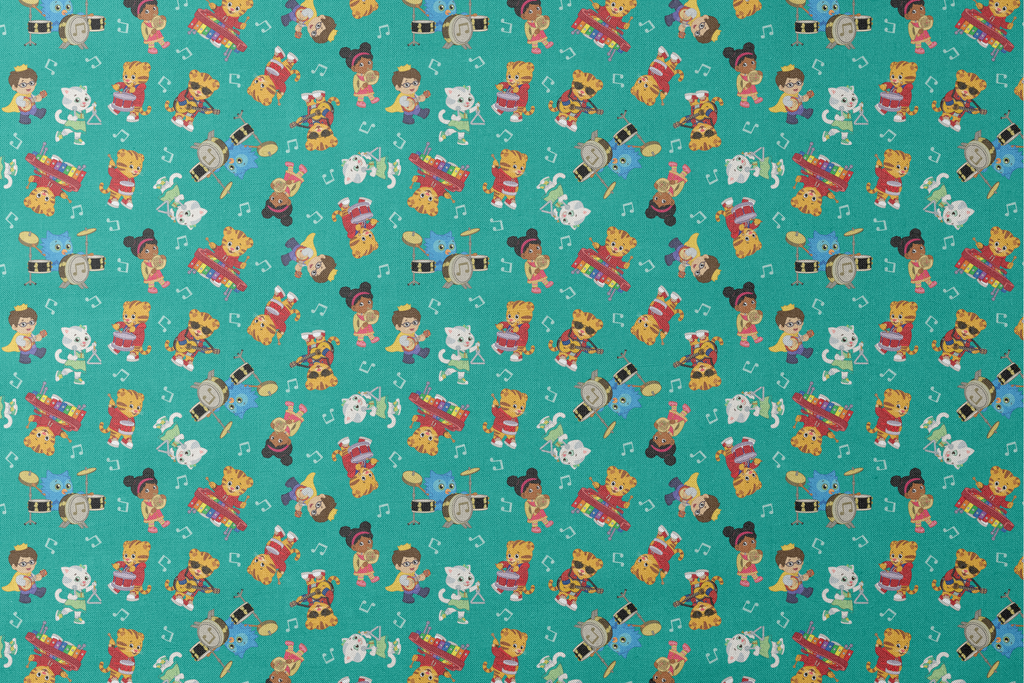 Daniel Tiger's Neighborhood pattern features Daniel Tiger and friends playing musical instruments on a slate background. Perfect for nursery decor, children's apparel, or playful accessories.