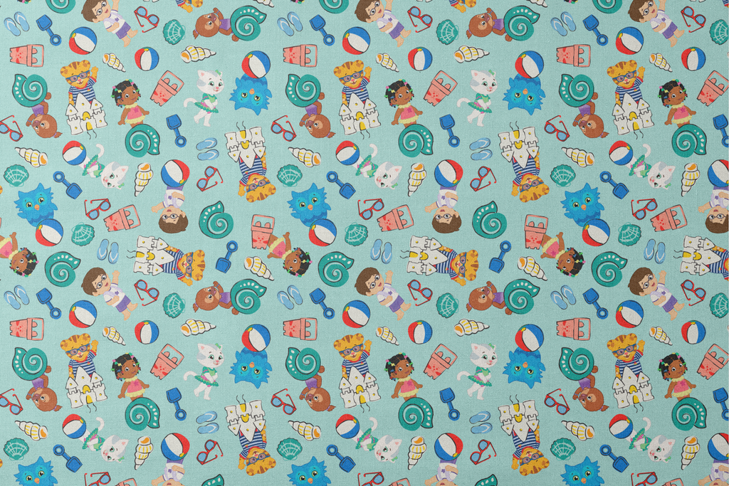 Adorable Daniel Tiger's Neighborhood beach day featuring beach balls, shells, sunglasses, and swirly seashells on an aqua background. Perfect for kids' summer clothing and accessories.