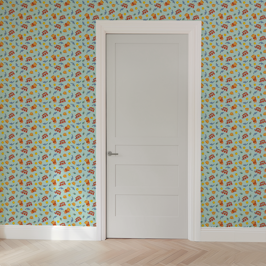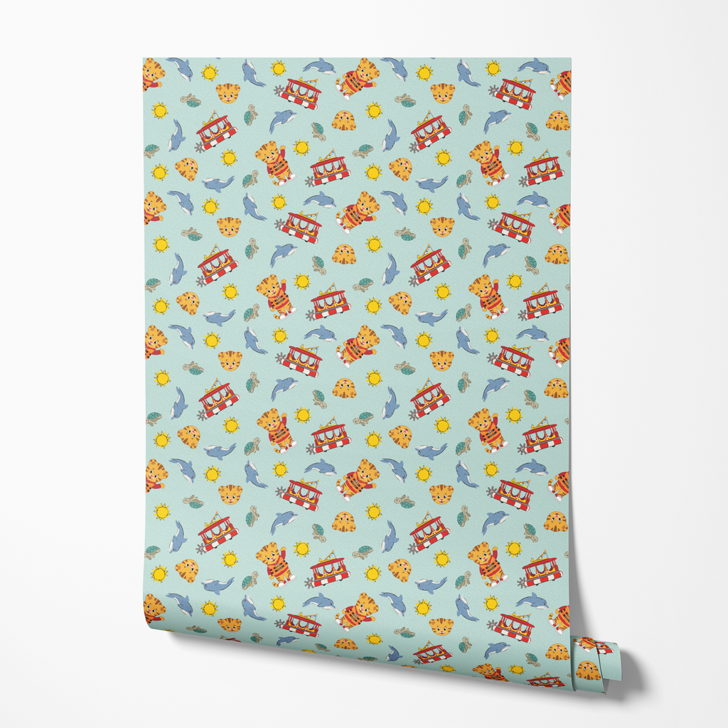 Daniel Tiger's Neighborhood ocean adventure featuring Daniel Tiger, Trolley and ocean friends on an aqua background perfect for children's room decor or nursery accessories.