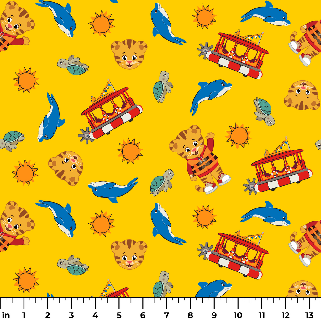Adorable Daniel Tiger's Neighborhood featuring Daniel Tiger, Trolley and ocean friends on a warm orange background perfect for kids' crafts and quilting projects.