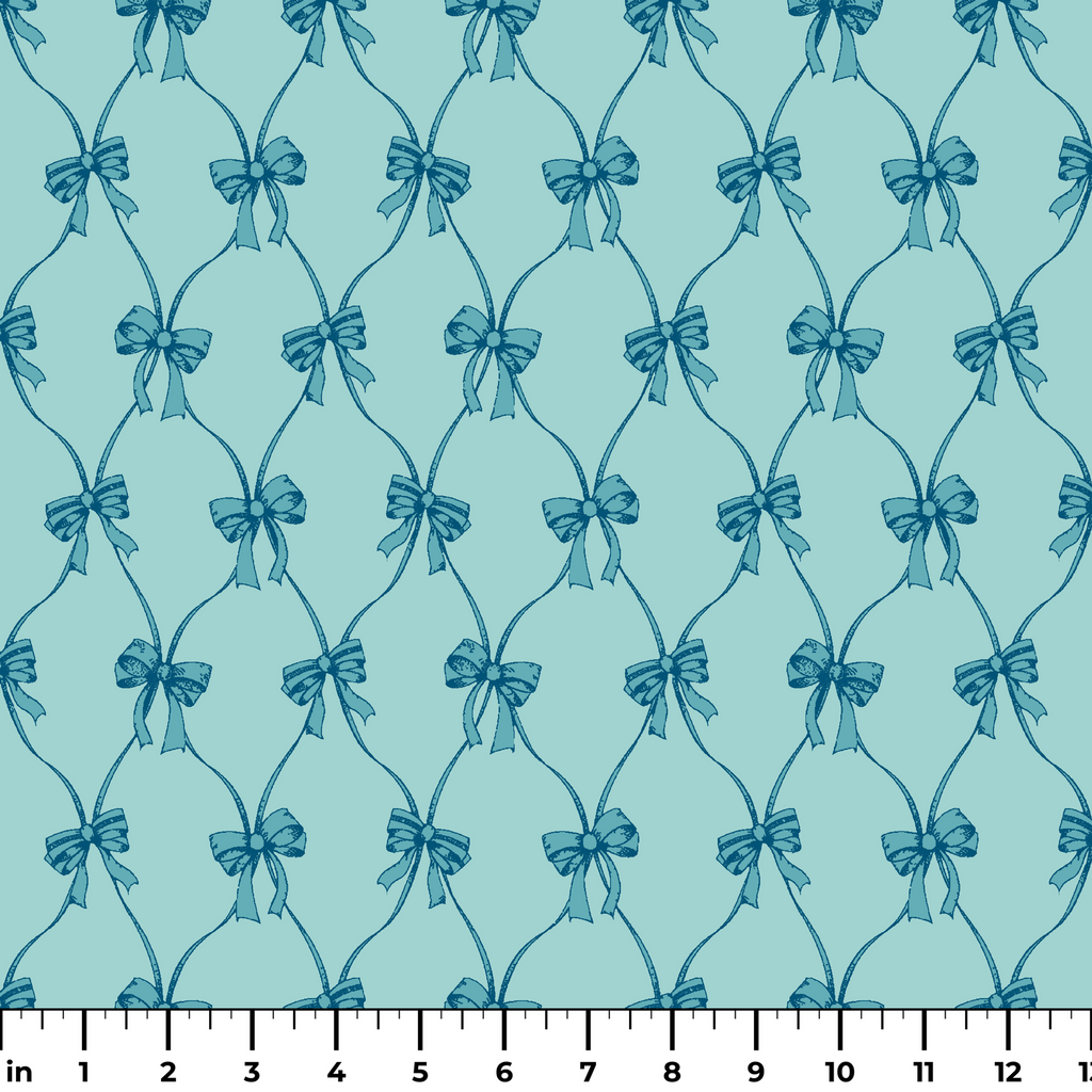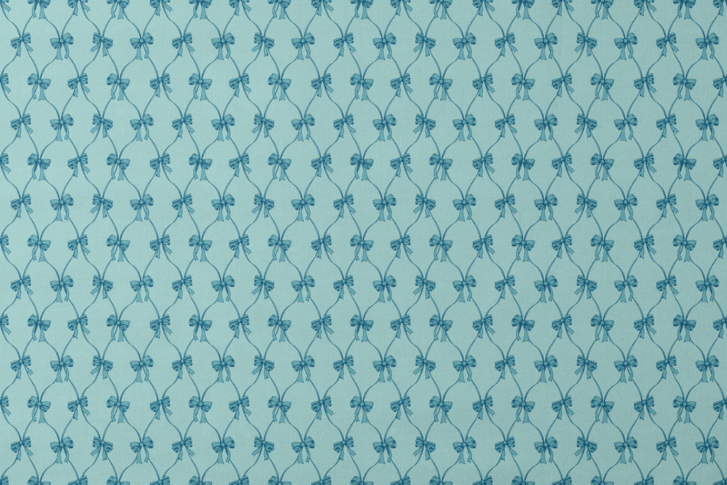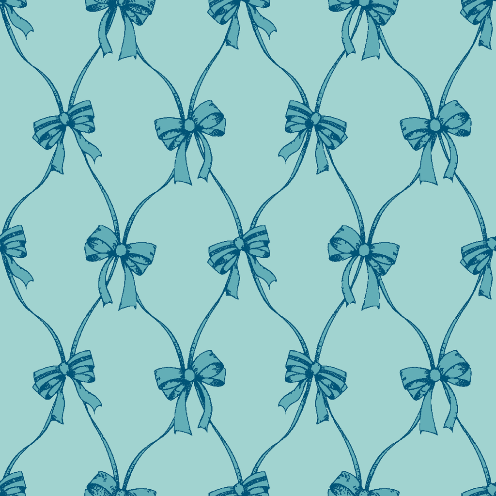 Elegant blue ribbon bows arranged in a lattice pattern on a turquoise background create a sophisticated design perfect for classic home decor.