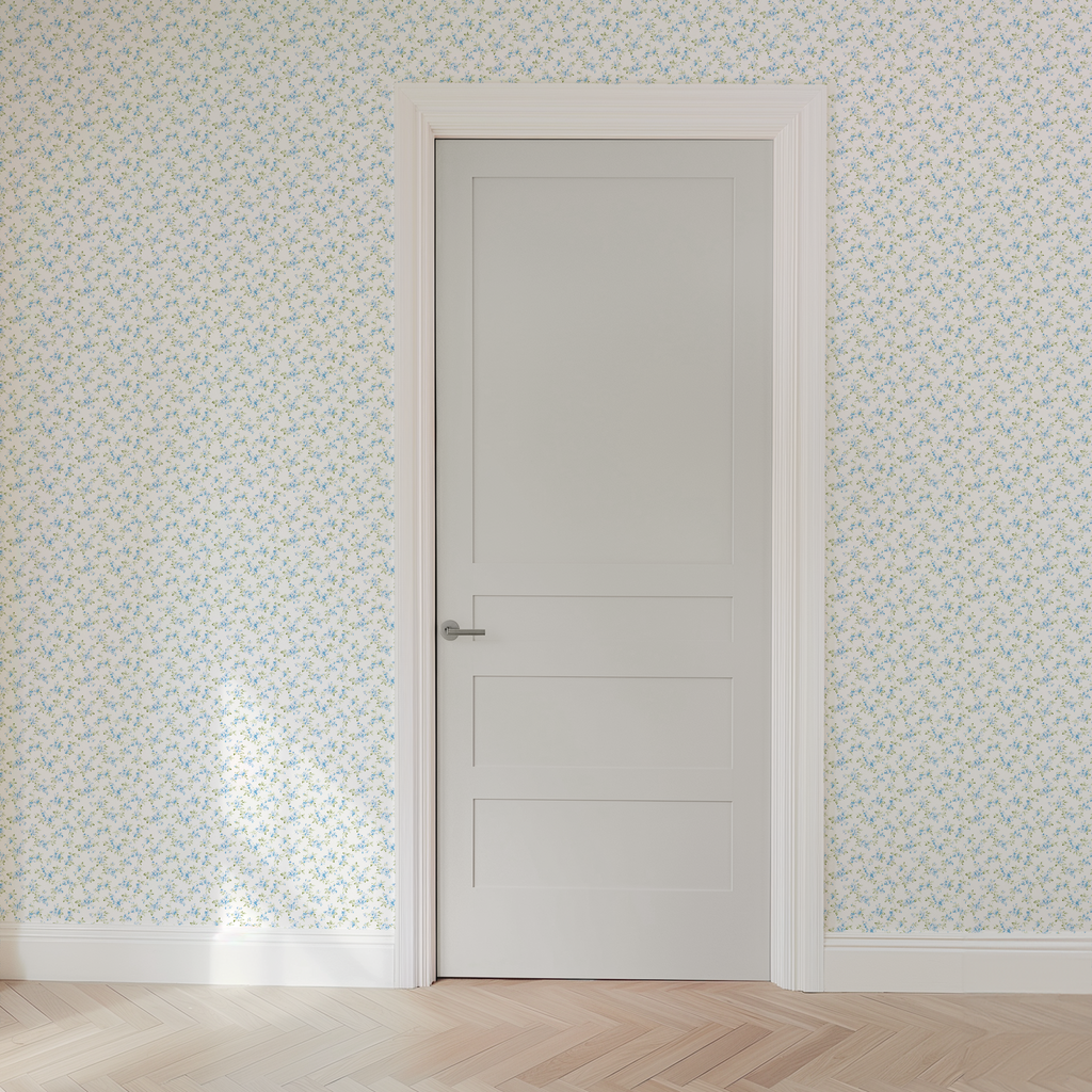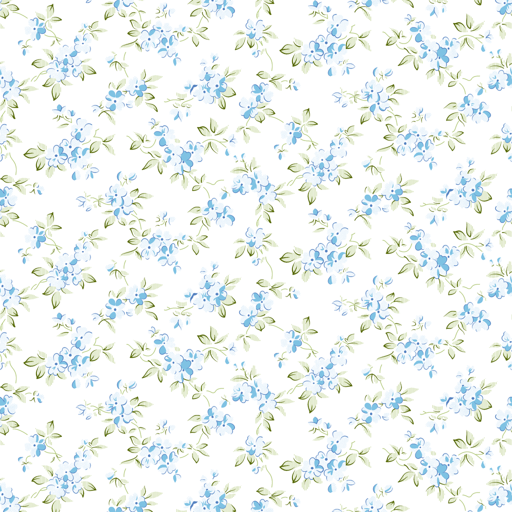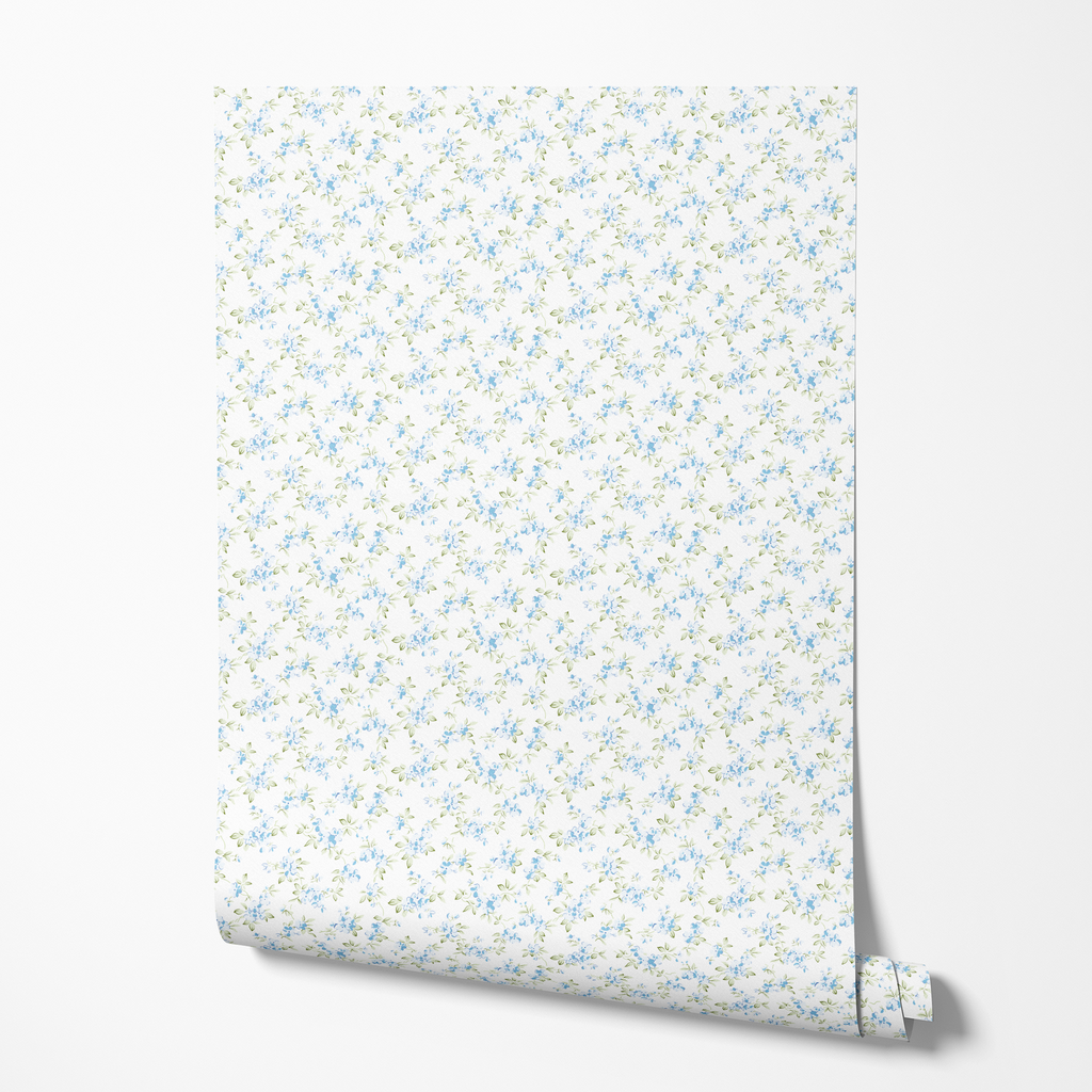Delicate blue floral pattern on a crisp white background. This timeless cottage-core design brings a fresh, vintage charm to your space with its dainty scattered blooms.