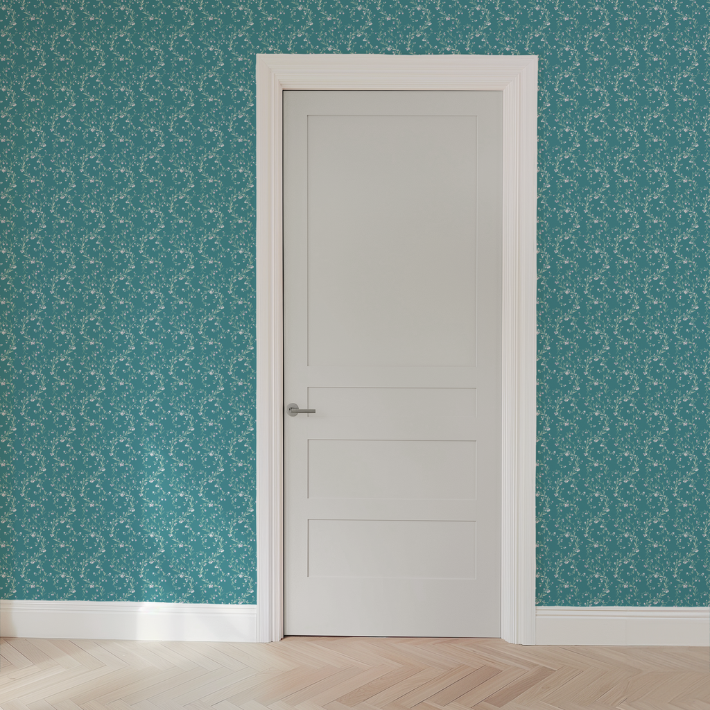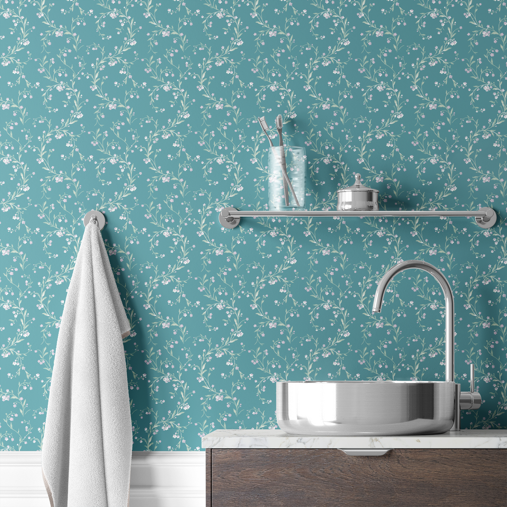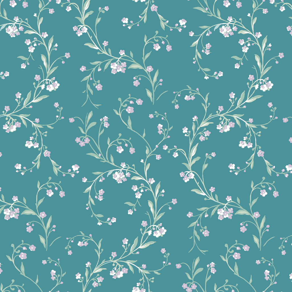 Delicate white floral sprigs dance across a soothing teal background in this elegant vintage-inspired pattern, perfect for adding a touch of tranquil charm to any space.