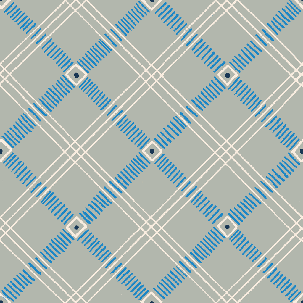 Modern geometric diamond pattern featuring white and blue lines creating a contemporary plaid design with small square accents on a gray background.