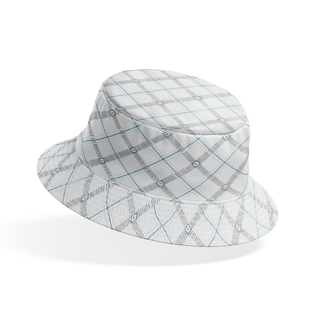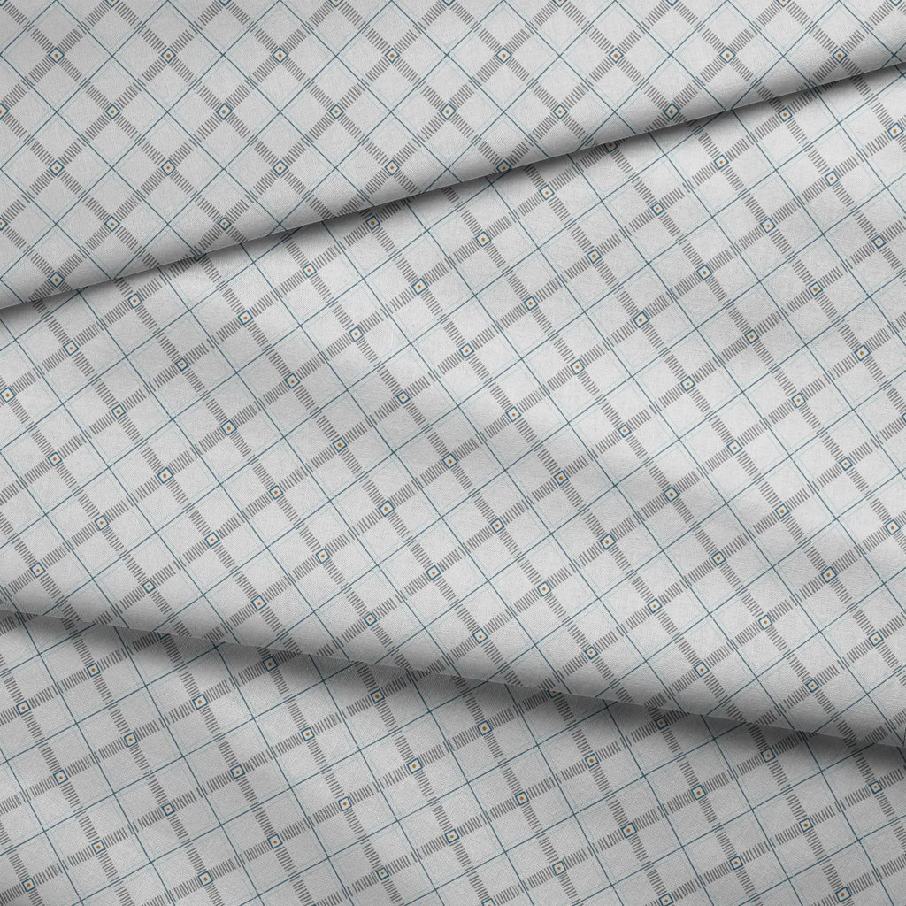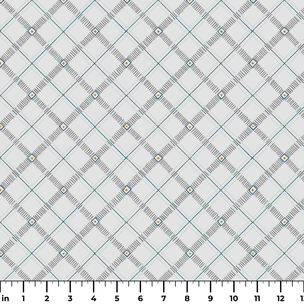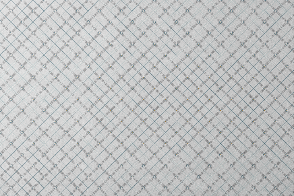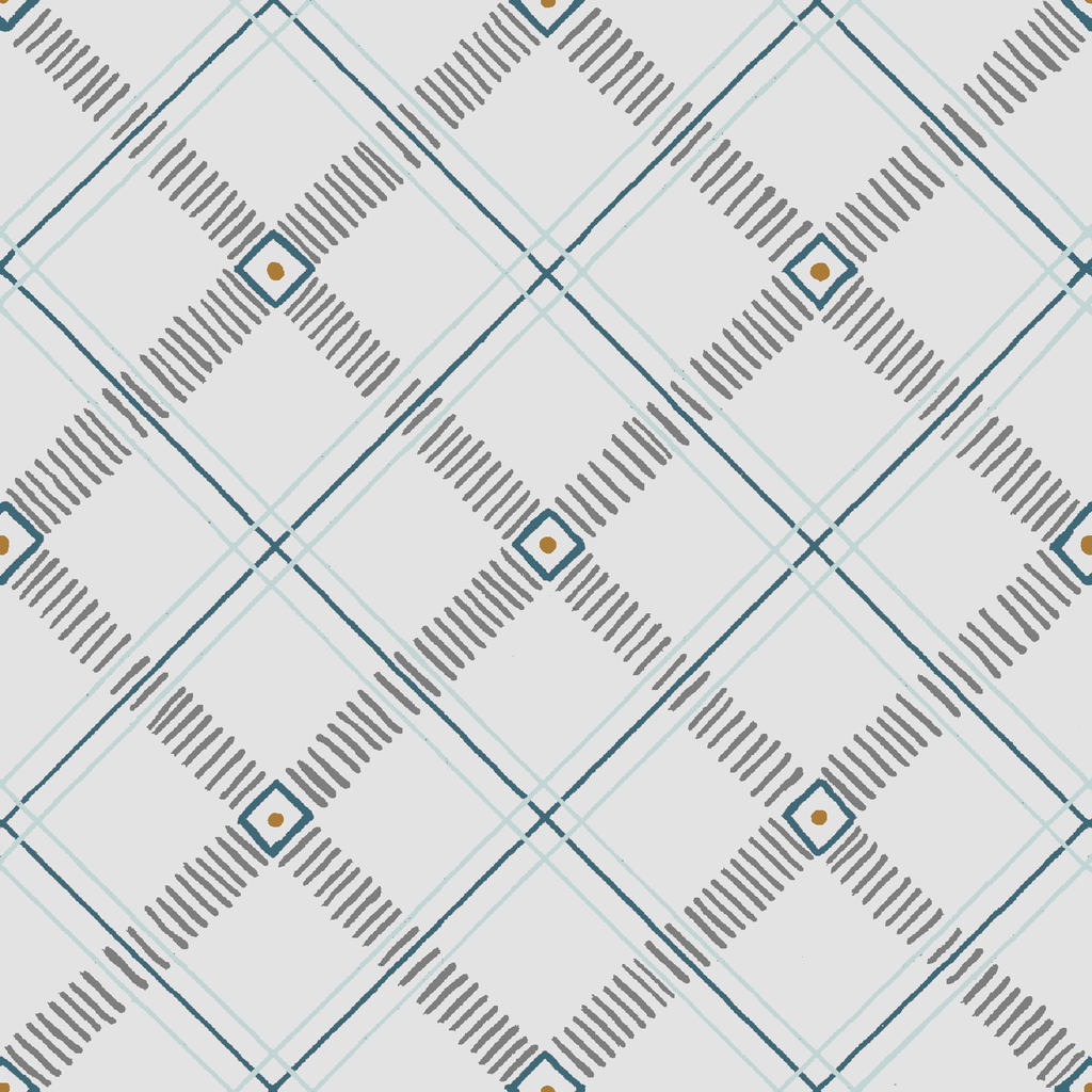 Modern geometric diamond pattern featuring teal and gray lines creating a contemporary plaid design with small square accents on a light gray background.