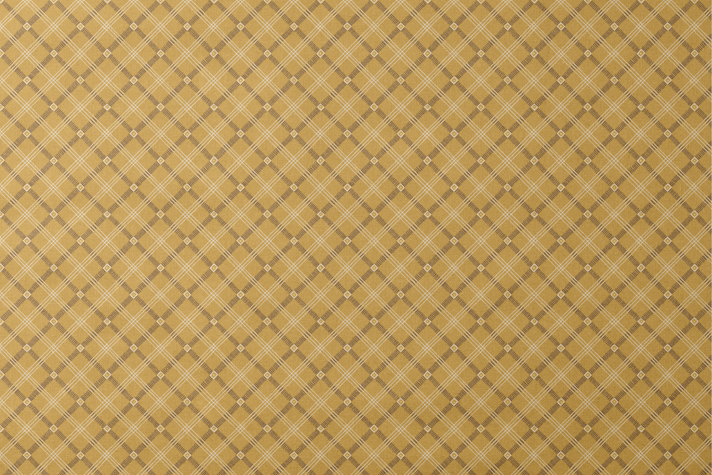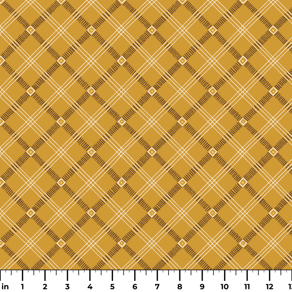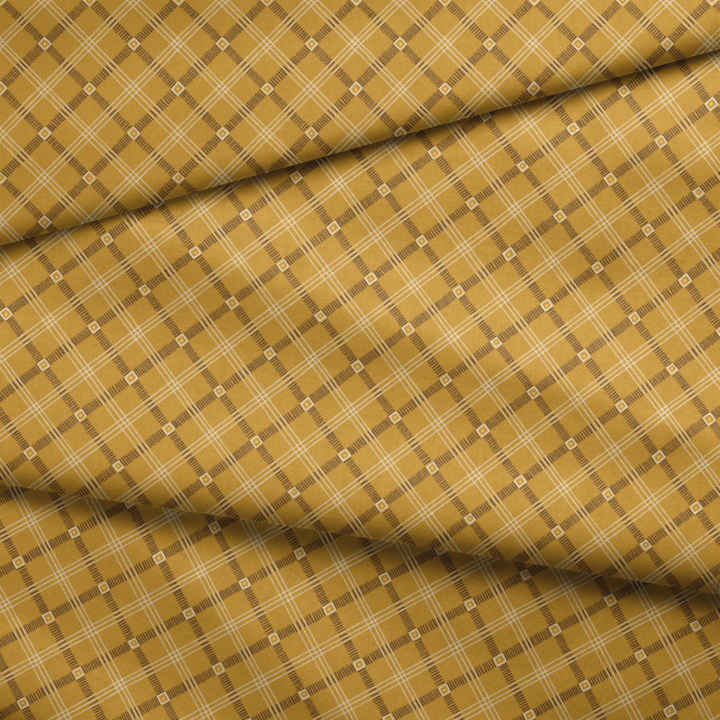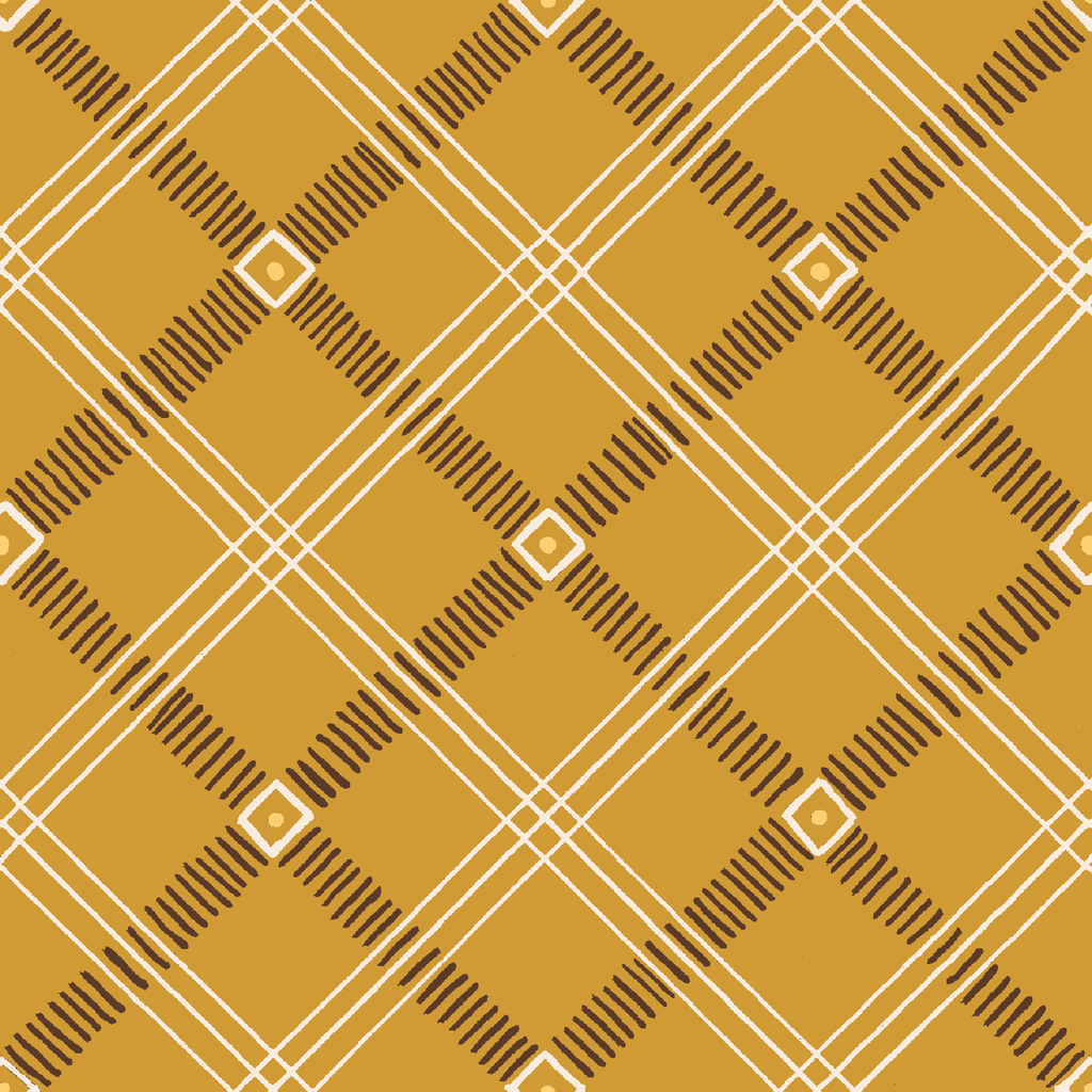 Modern geometric diamond pattern featuring white and black lines creating a contemporary plaid design with small square accents on a mustard yellow background.