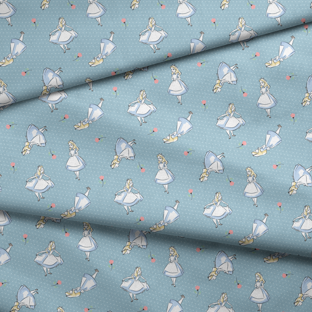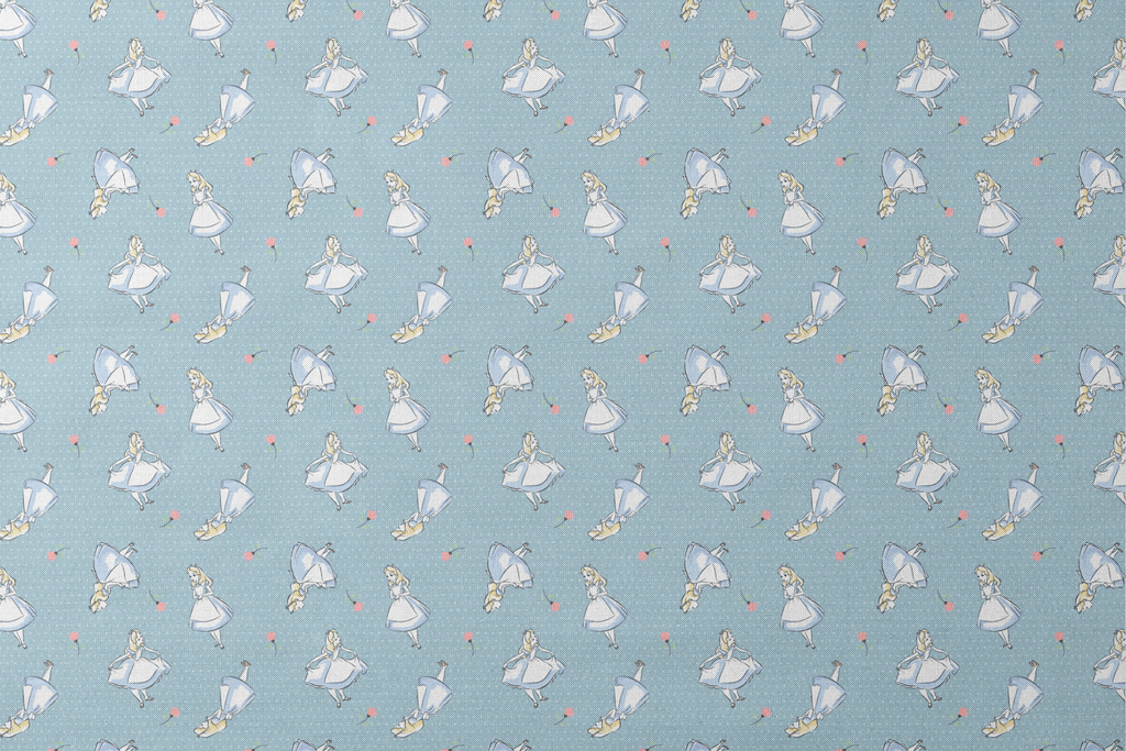 Whimsical Alice in Wonderland themed pattern featuring the classic character amid pink flowers on a polka dot light blue background. Perfect for children's apparel or nursery decor.