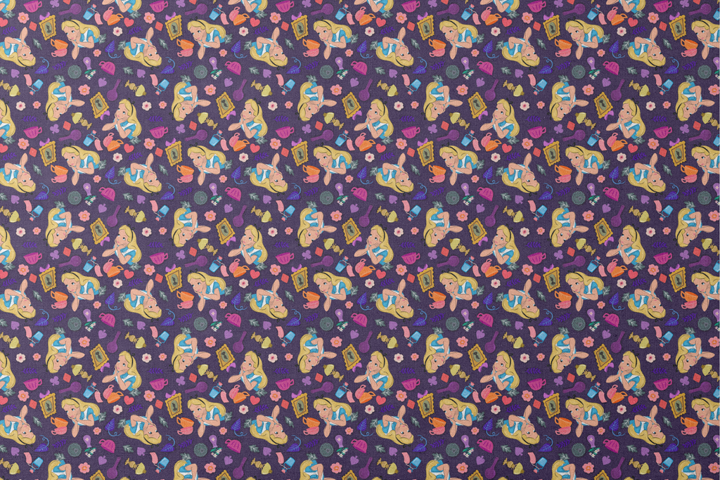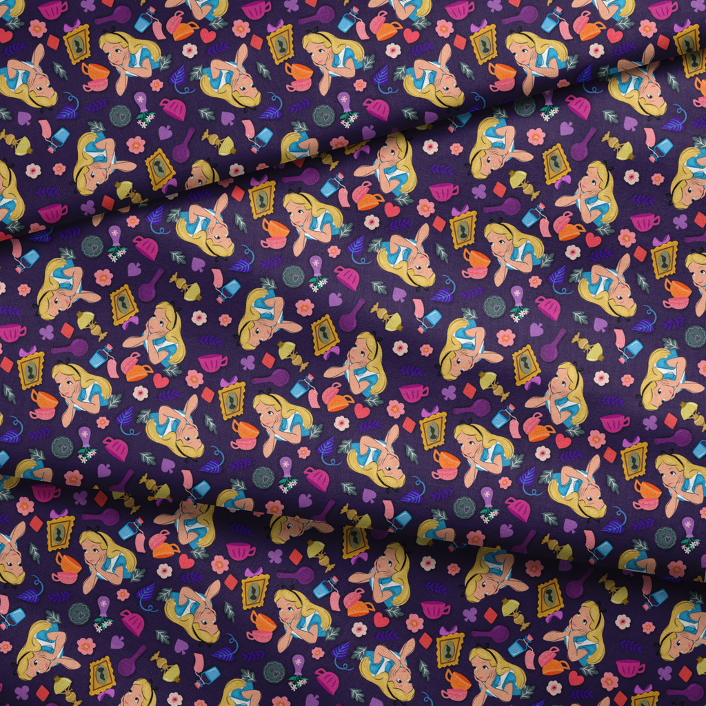 Tumble down the rabbit hole with this enchanting Disney's Alice in Wonderland fabric featuring a deep purple background adorned with whimsical motifs. Colorful teacups, ornate picture frames, potion bottles, and decorative flowers swirl around the curious character in her iconic blue dress. The vibrant pinks, oranges, blues, and purples create a magical contrast against the rich background, capturing the wonder and curiosity of this classic tale. Perfect for creating one-of-a-kind children's garments or crafting a special themed tote bag.