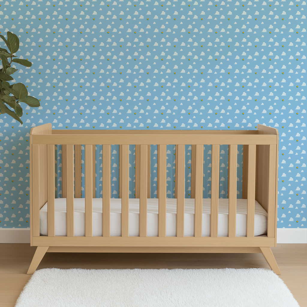 Dreamy blue sky featuring fluffy white cartoon clouds and colorful Disney and Pixar's signature ball, perfect for cheerful nurseries or summer-themed spaces.