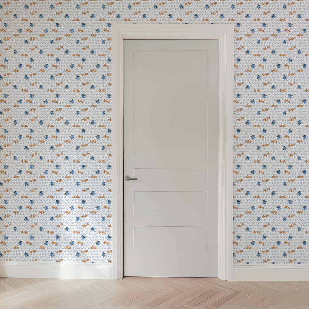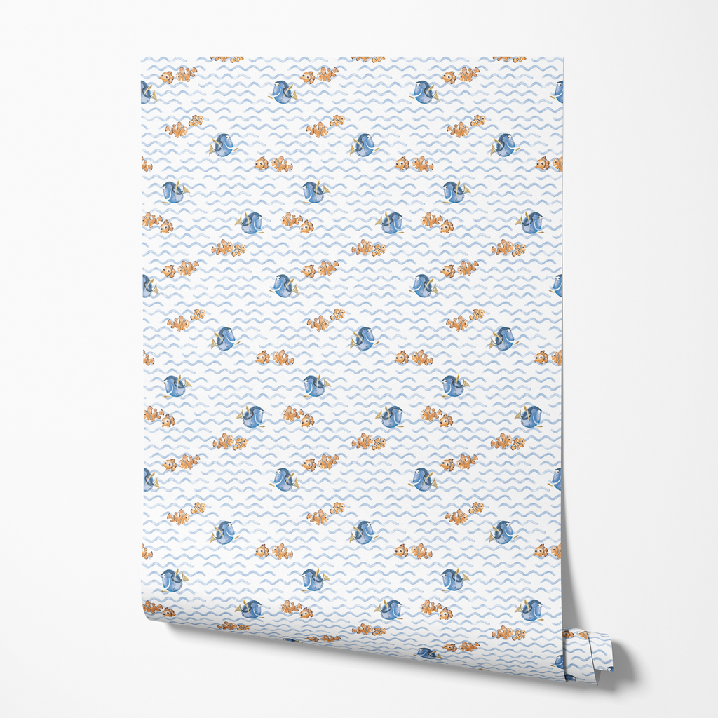 Adorable Disney and Pixar's Finding Nemo pattern featuring Dory, Nemo and Marlin swimming in blue waves. Perfect for ocean-themed nurseries and kids' rooms.