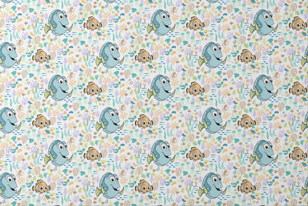 Colorful Disney and Pixar's Finding Nemo pattern featuring Dory and Nemo swimming among coral reef patterns in blue, orange and pastel colors - perfect for kids' crafts or Disney themed nursery decor.
