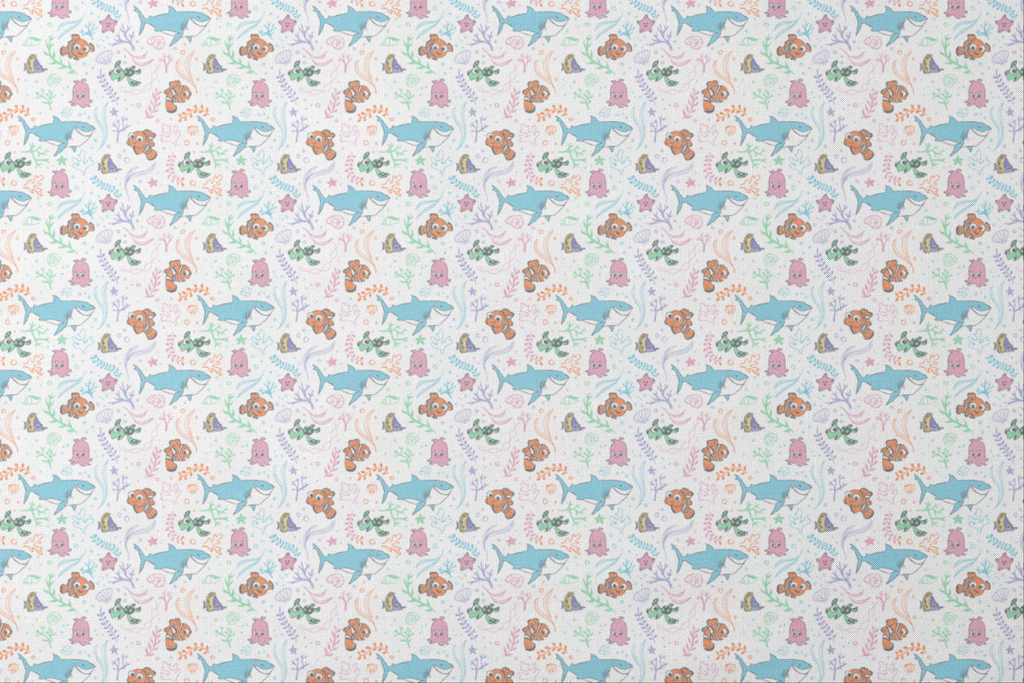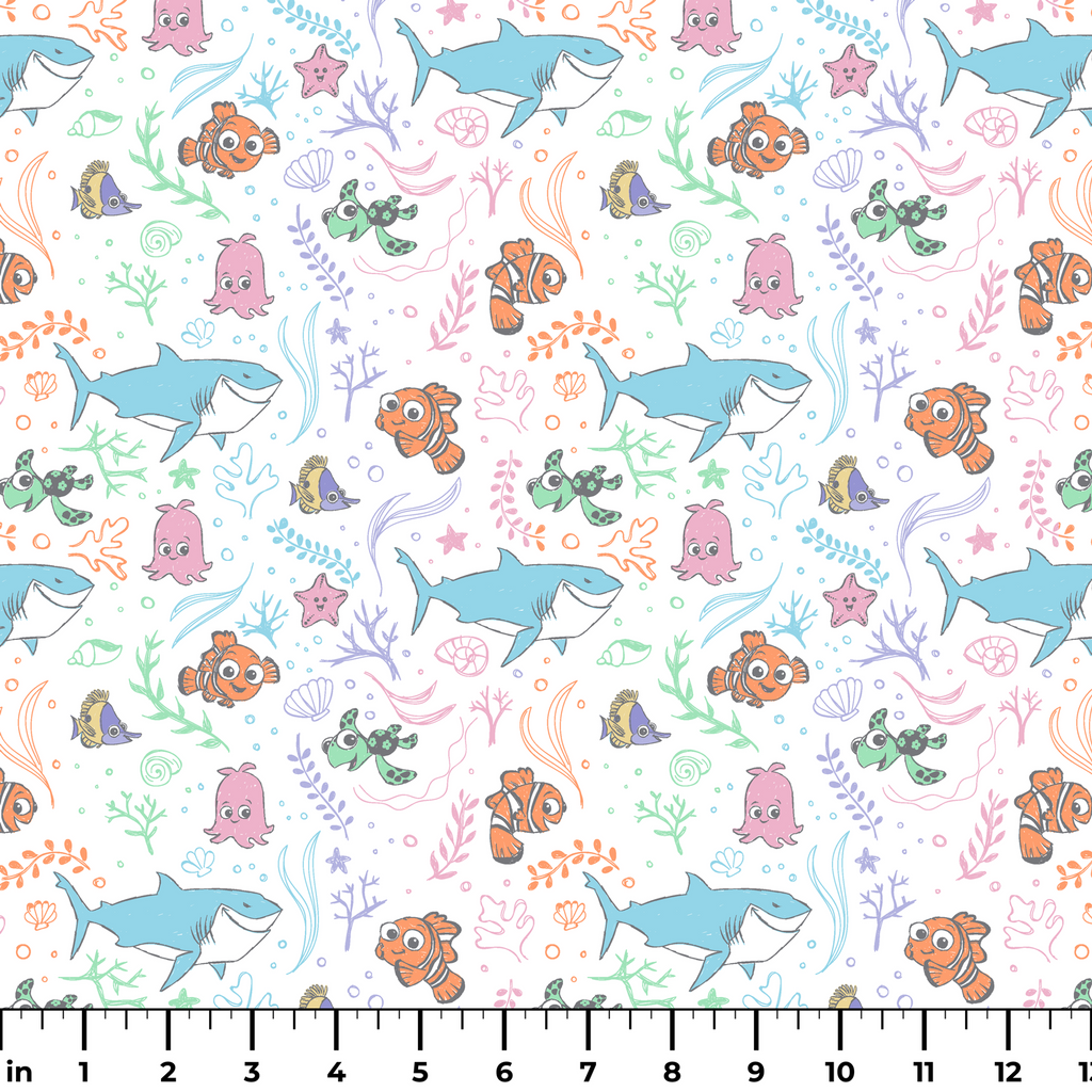 This playful Disney and Pixar's Finding Nemo pattern features Nemo, Squirt and other favorite sea friends swimming among coral and seaweed on a light background. Perfect for children's home decor!