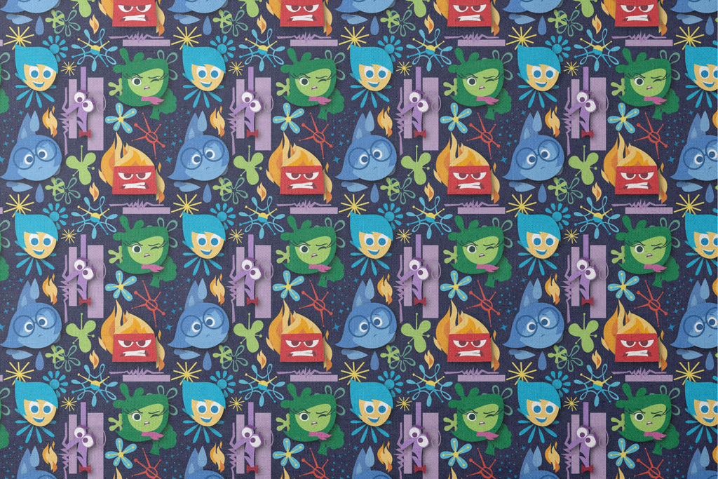 Colorful Disney and Pixar's Inside Out emotions pattern featuring blue, red, green, and purple characters on a dark background. Vibrant abstract shapes and flames add playful energy to this whimsical design.